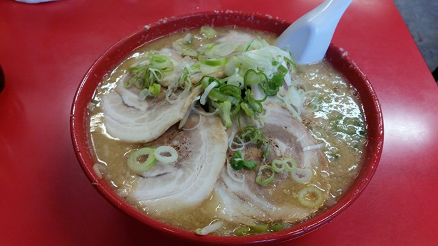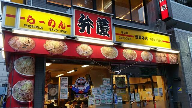 こちらの弁慶というお店。体に悪そうなラーメンが入り口周りに撒き散らしてある……。この肉がはみ出している感じ、どう考えても体に悪いでしょう。