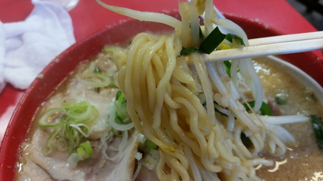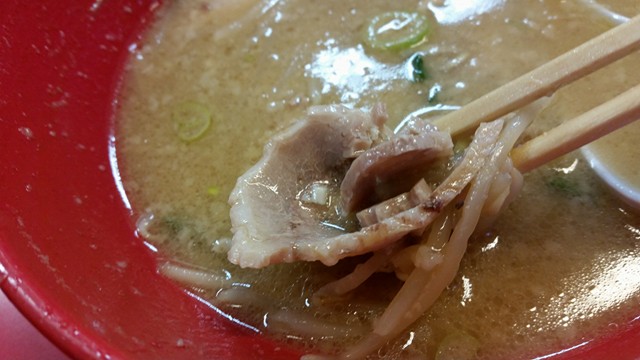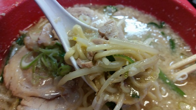 そんないらぬ覚悟を胸にスープを一杯、ズズズっと入れると、もう広がる味噌と脂。非常に濃ゆいお味です。舌の中でとろんと味噌を感じれる、深みのあるスープ。そこにドロンな脂が絡まれば、もうやめられない止まらない。カッパエビセンくらいの中毒性のある飲みごたえです。