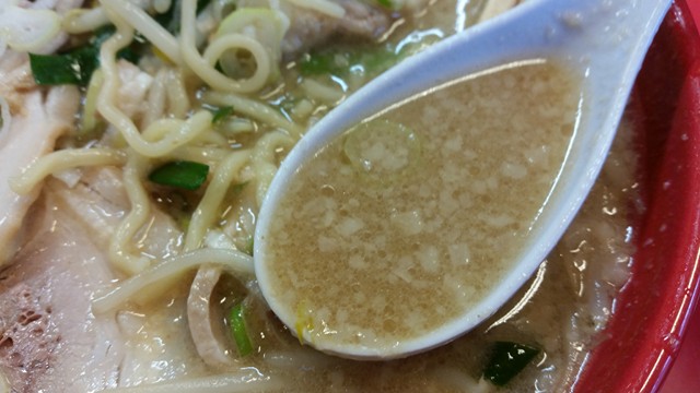スープ単体を見てみると、コレステロール値のたかそうな物体がプーカプーカ。味噌なのか脂なのか……。