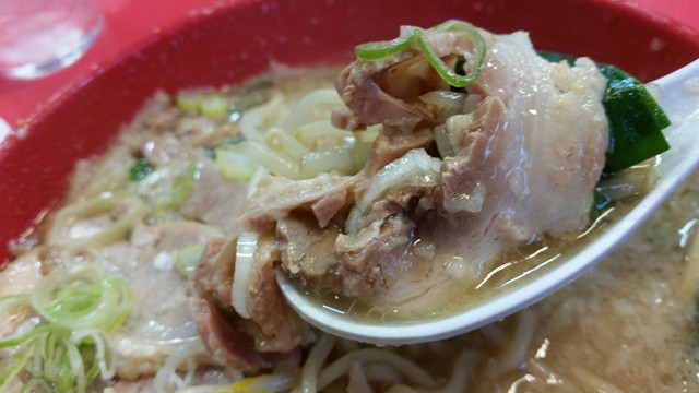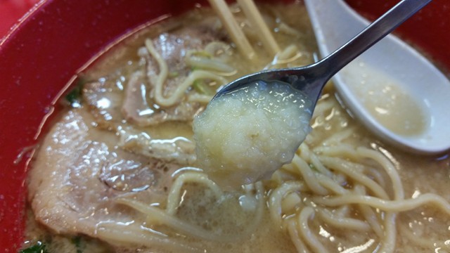 あああああもう、とろっとろのツヤッツヤ。スープ自身の脂と、チャーシューの脂が混じり合いよりパワーアップした究極体へと変貌を遂げています。むはっとひと口いただくと、いい意味で、全くもって歯ごたえなし。脂と脂が絡まりあって歯が必要でないほどのとろけ具合を醸します。