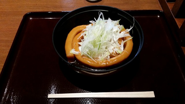 こちらは『一本うどん』というメニュー。他の店舗は大盛り天丼やうなぎ等、王道に旨そうなものが並んでいましたが、この一本うどんに心奪われた僕。せっかく90分かけて歩いてきたのでこの珍しいメニューをチョイス!
