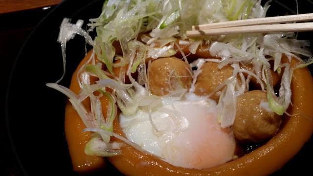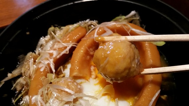 ネギをほじくると、下から温泉卵とつくねがこんにちは😀早速、こんにちはした温玉をぶち破り、ソースとしていただきましょう!