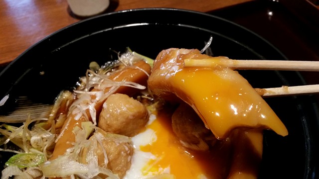 その名の通り、一本のうどんがどんっ!凄まじい存在感です。むさぼりつくと最高にもっちりな食感。歯ごたえがありまくり!風味は焦がし醤油のような香ばしさがありますね。