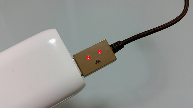 まずモバイルバッテリー等と繋ぐと目が赤く光ります。
