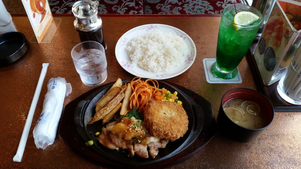 今回は日替わりランチの『黒毛和牛入りメンチカツ&おろしチキンステーキ830円』をチョイス!+100円でドリンクもつけましょう。今回はジンジャーエールです。