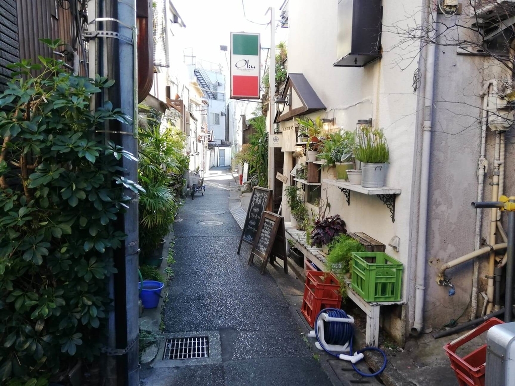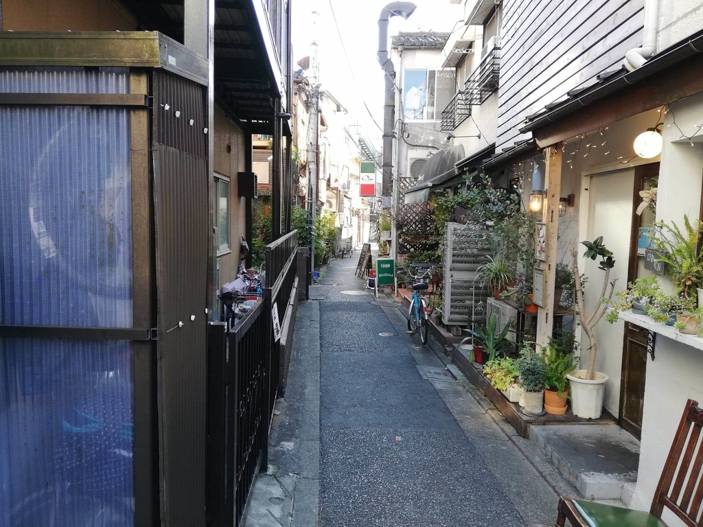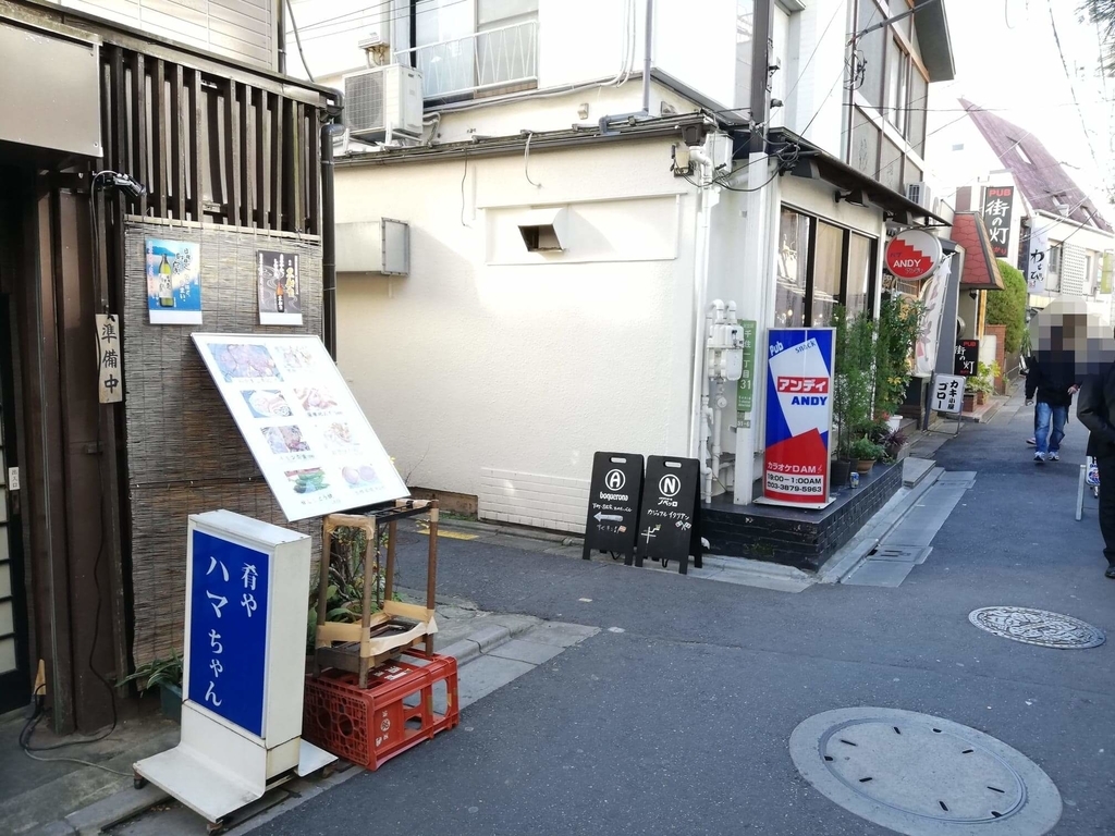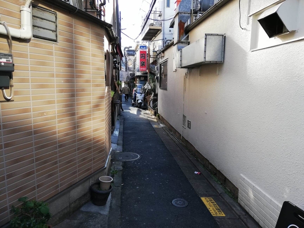 ④この建物の横にある小道をまっすぐ進むと『肴やハマちゃん』の看板が出てきます。今度はこの小道に入ります。