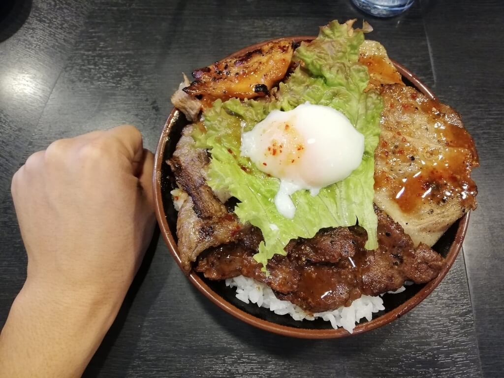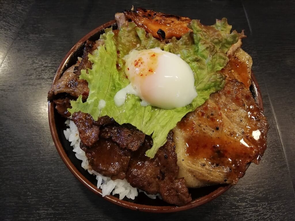 焼肉丼たどんのBIG丼に乗っているハラミ 焼肉丼たどんのBIG丼に乗っている豚ロース 焼肉丼たどんのBIG丼に乗っている鶏肉かしわ