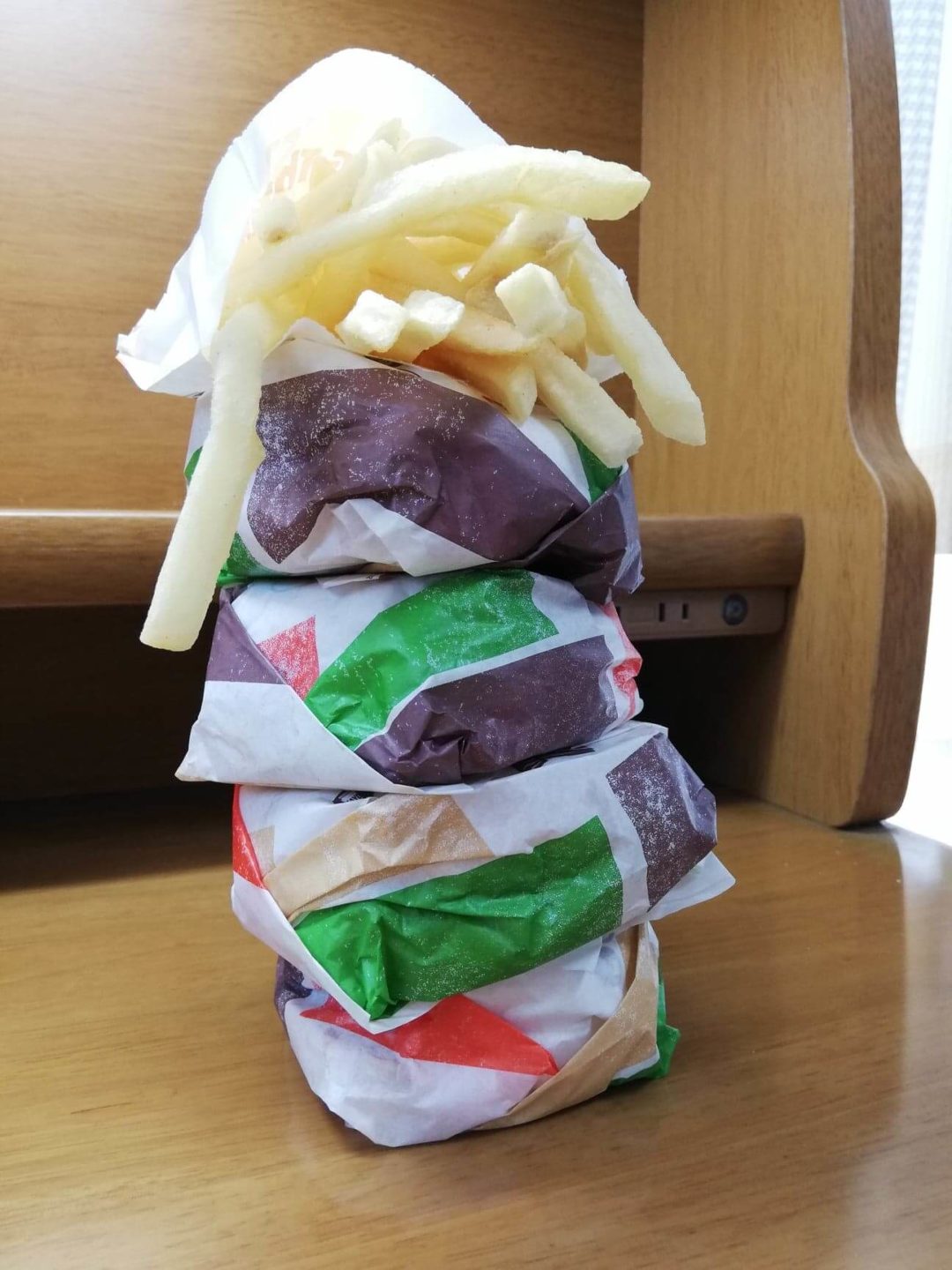 バーガーキングでバーガー4個ってなかなかの金額になるのですが、これだけ積み上げても990円。1,000円以内に収まってしまいました!