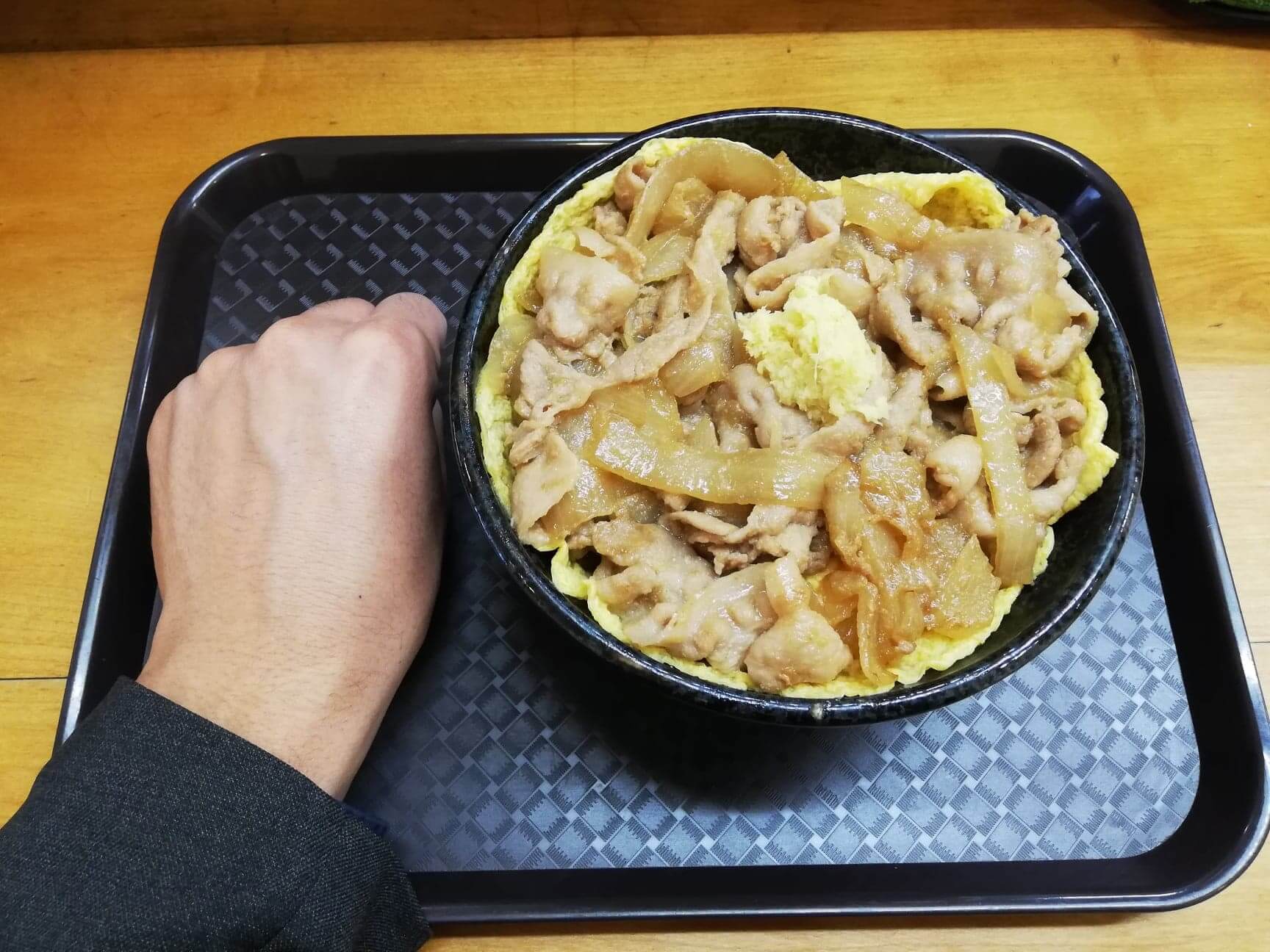 江古田『笑姜や』の、理想の生姜焼き丼と拳のサイズ比較写真拳と比べてもナイスなボリューム。丼なのでそれなりの深さもありますし。