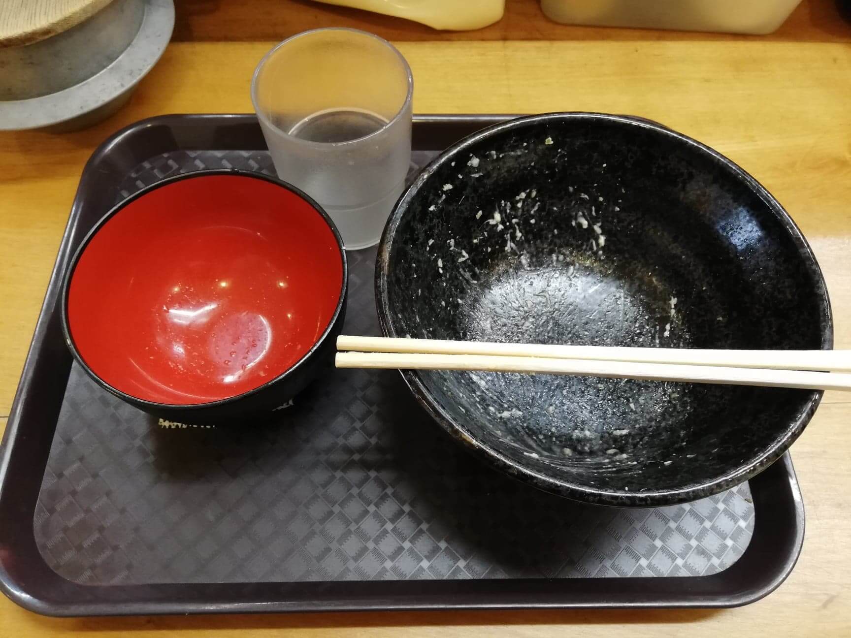 江古田『笑姜や』の、理想の生姜焼き丼のアップ写真 空の器の写真生姜のピリ辛感とマヨネーズの脂っこさでバクバク箸が進み、完食!ごちそうさまです!