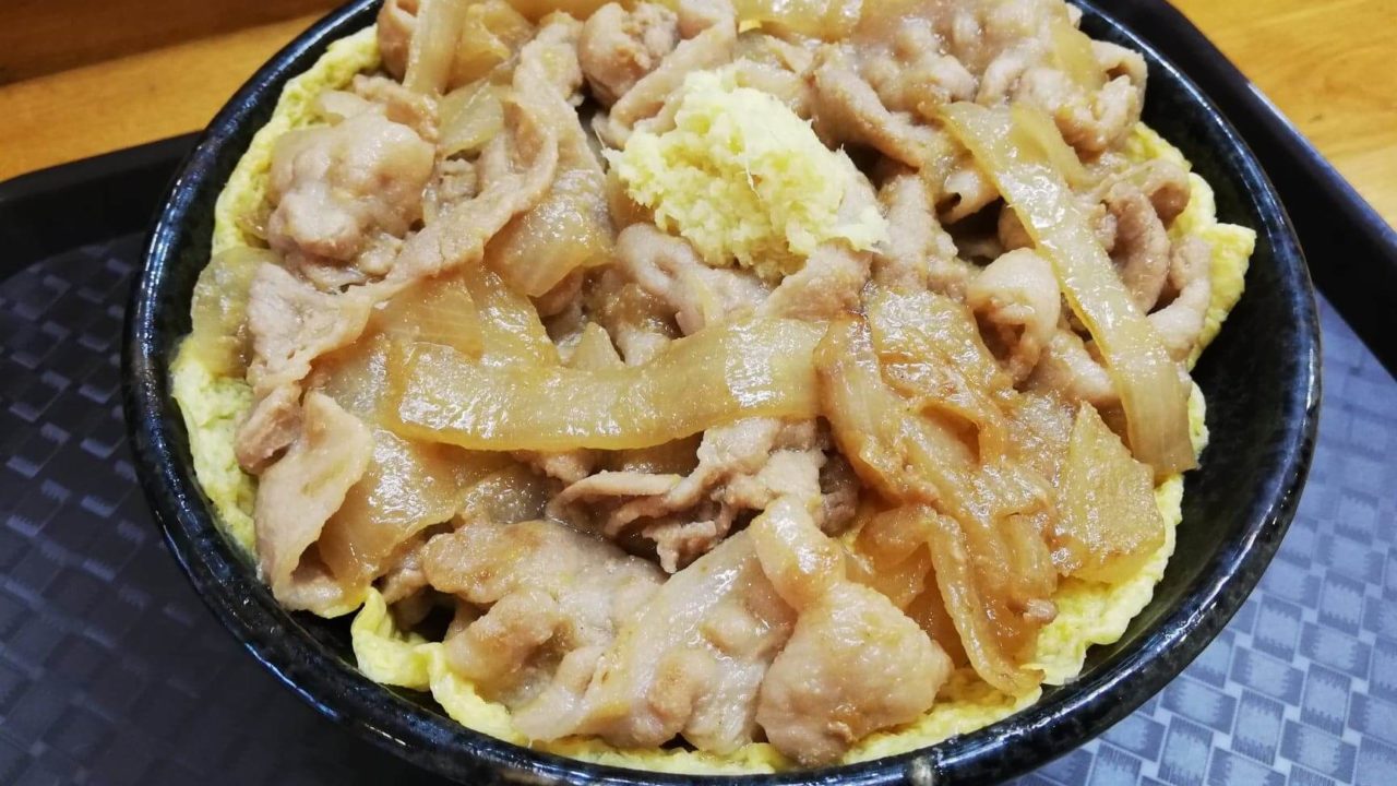 江古田『笑姜や』の、理想の生姜焼き丼にマヨネーズをかけた写真