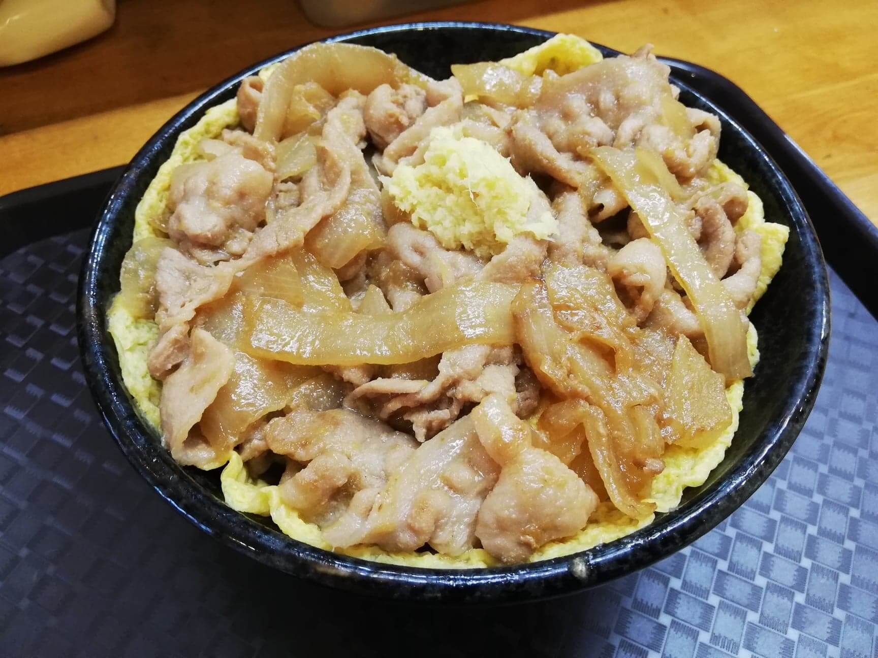 江古田『笑姜や』の、理想の生姜焼き丼のアップ写真結構深めに具材とライスが入ってます!なかなかのボリューム。