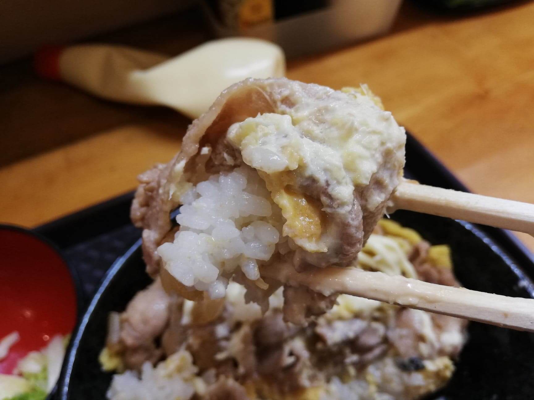 江古田『笑姜や』の、理想の生姜焼き丼を箸で持ち上げた写真
