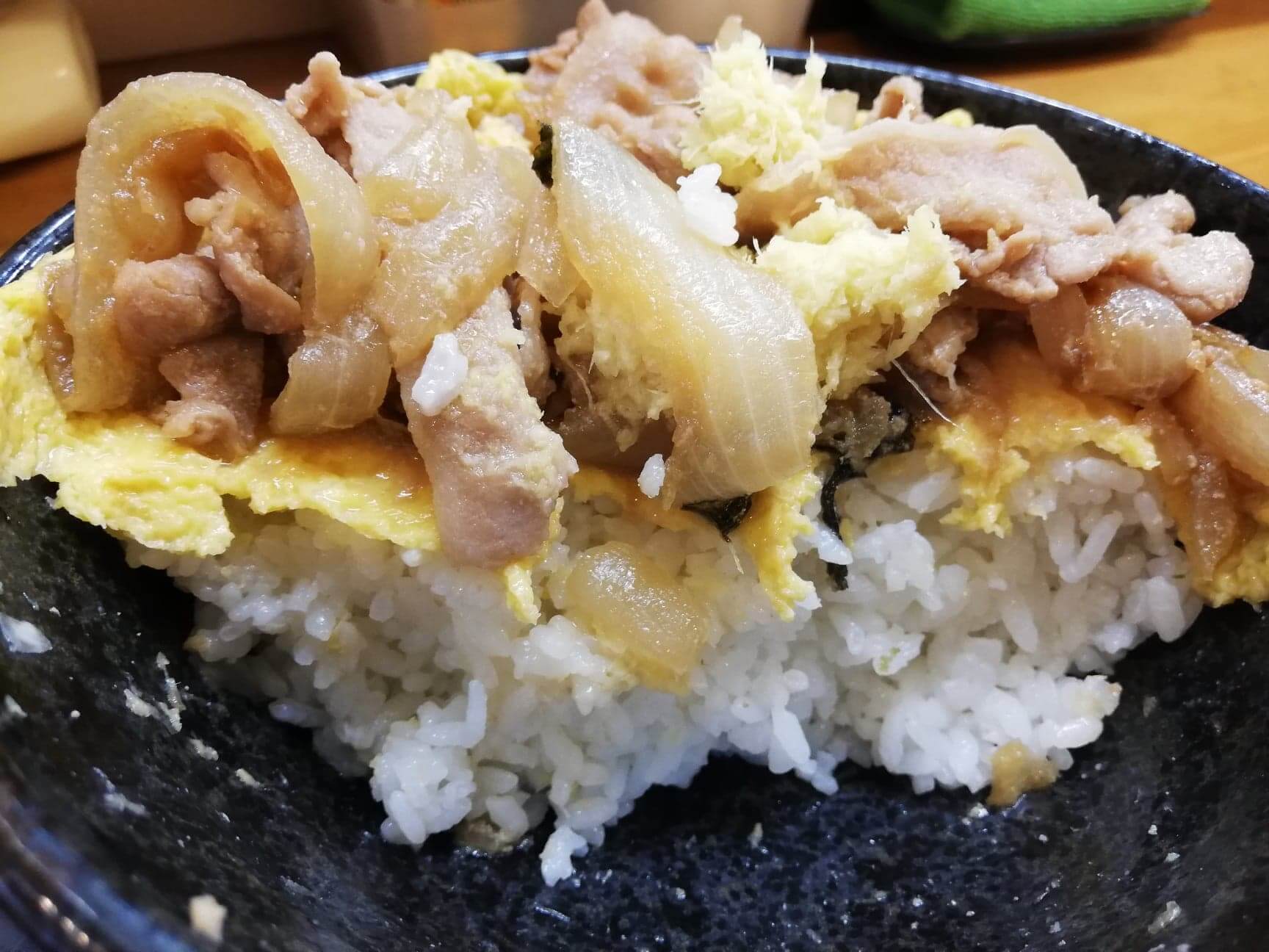 ほどよい刺激の生姜と豚肉の相性は抜群!下の卵もフワフワ加減がクセになりますねえ。