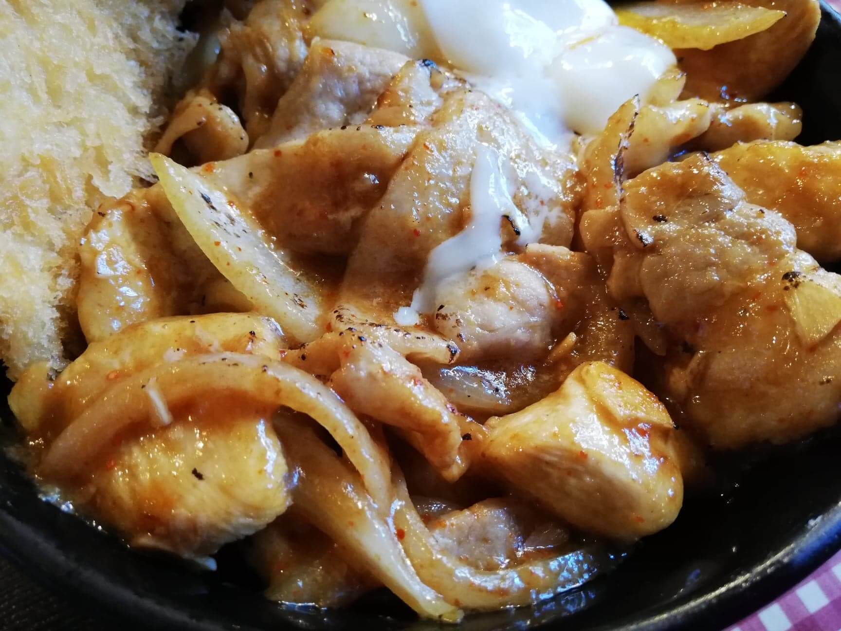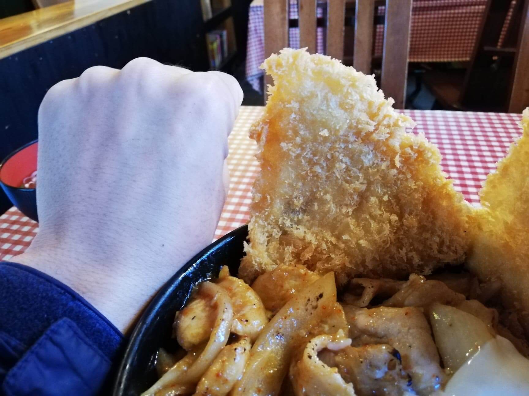 江古田『キッチン男の晩ごはん女の昼ごはん』のスタミナ野郎丼(極み)と拳のサイズ比較写真 江古田『キッチン男の晩ごはん女の昼ごはん』のスタミナ野郎丼(極み)のアップ写真そして目を引くのは、丼から生えた、羽。この香ばしさで僕らを天国へ誘おうというのでしょうか?