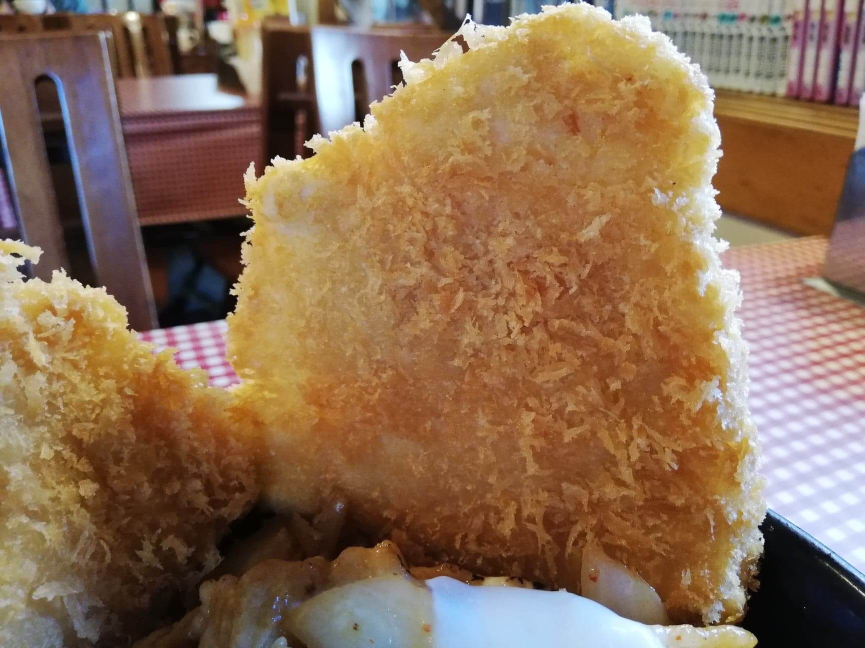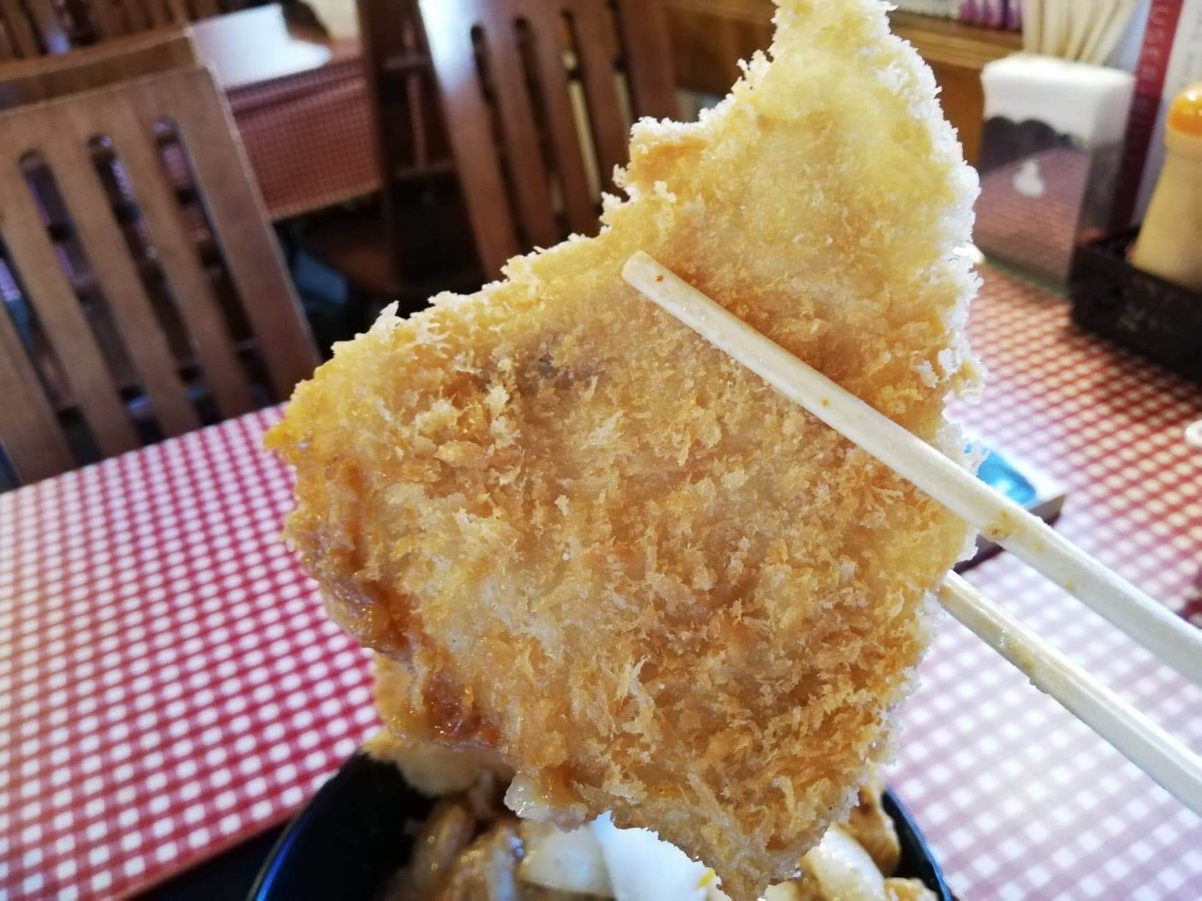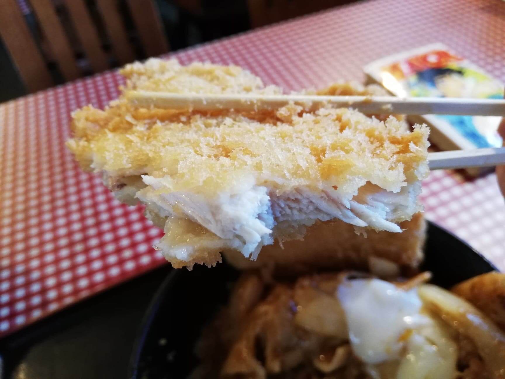 江古田『キッチン男の晩ごはん女の昼ごはん』のスタミナ野郎丼(極み)のカツを箸で持ち上げた写真 江古田『キッチン男の晩ごはん女の昼ごはん』のスタミナ野郎丼(極み)のカツの断面写真カツがなかなかの重量級。衣が厚めですが、肉にも噛みごたえはバッチリ。