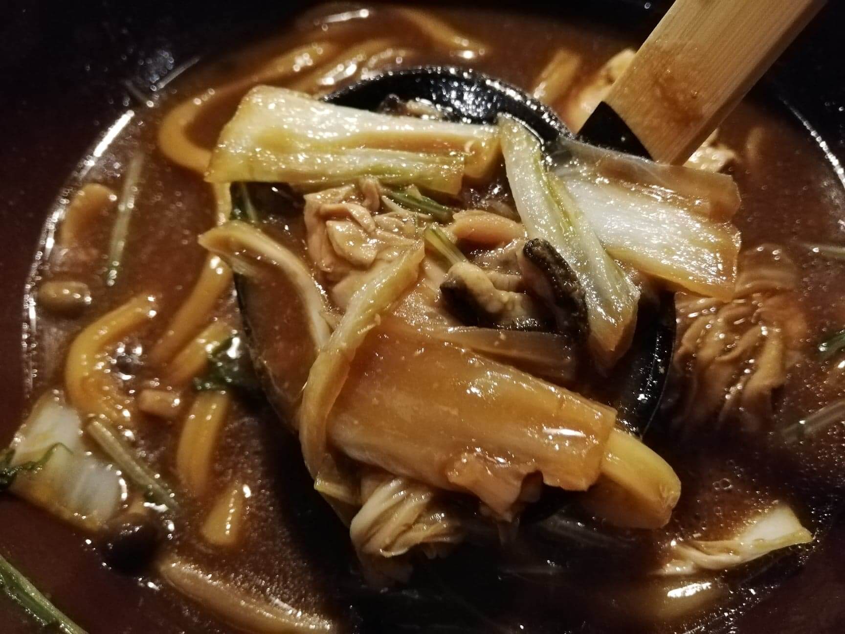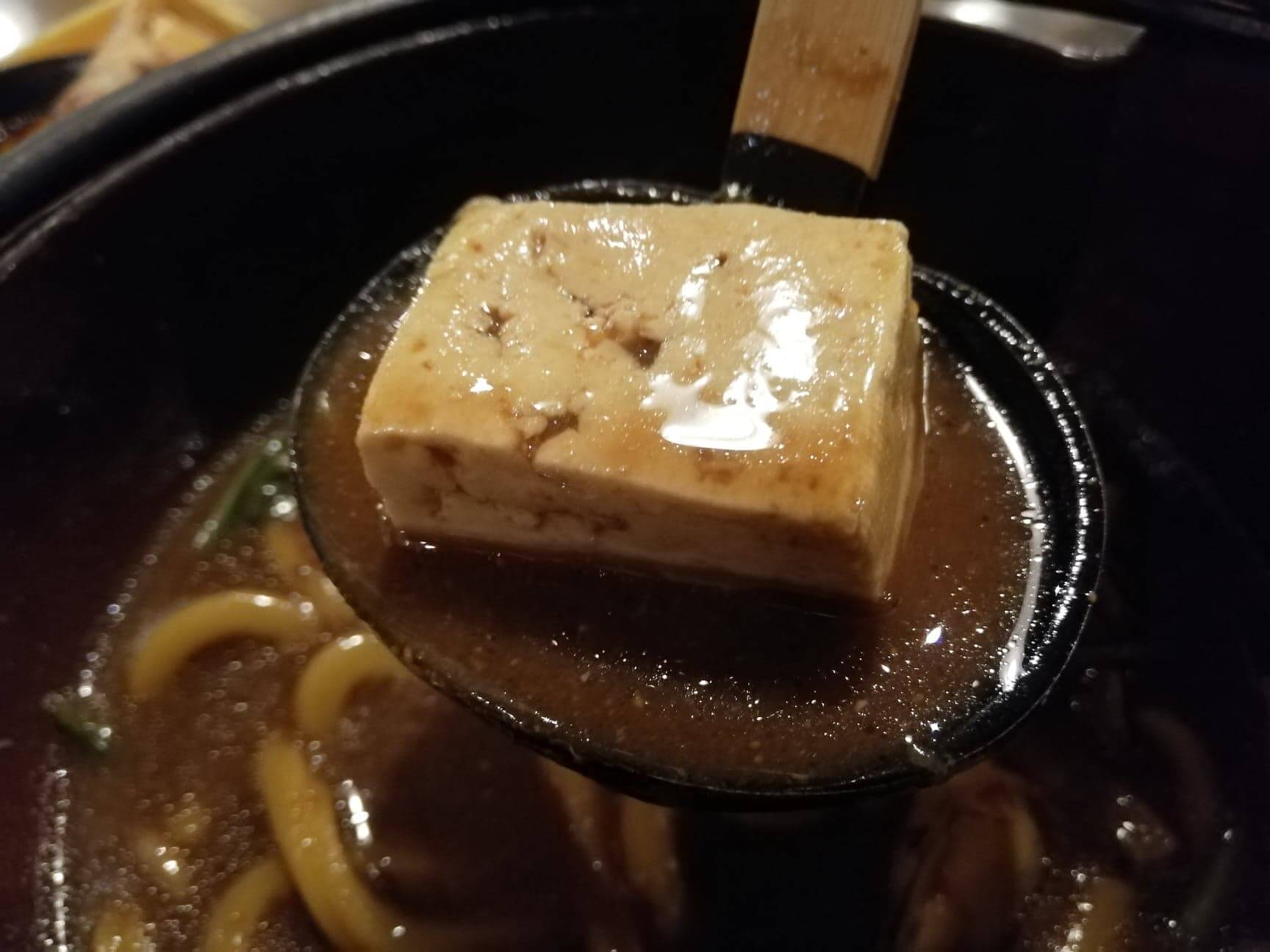 豆腐や白菜などの具材が入っています。味噌がしっかり染み込み、噛むと濃いダシが溢れてきてうんめえです!