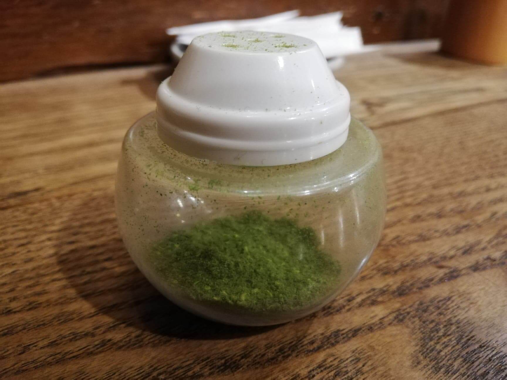 広島県の宮島『あなごめしうえの』の山椒の写真 広島県の宮島『あなごめしうえの』のあなごに山椒をかけた写真緑のは山椒です。適量ふりかけると、舌がちょっとジンジンしますよ。かけすぎ注意で。