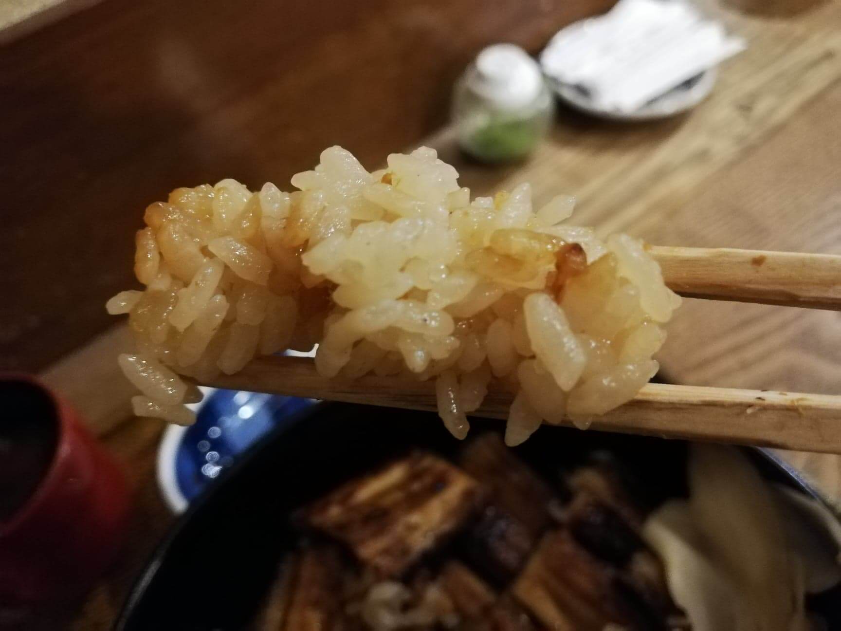 広島県の宮島『あなごめしうえの』のライスの写真『良き丼の条件とは、ライスへのタレも抜かりがないことである』という名言がありますが、これもまさに。まんべんなく染みており、やや焦げがあるのが最高です。
