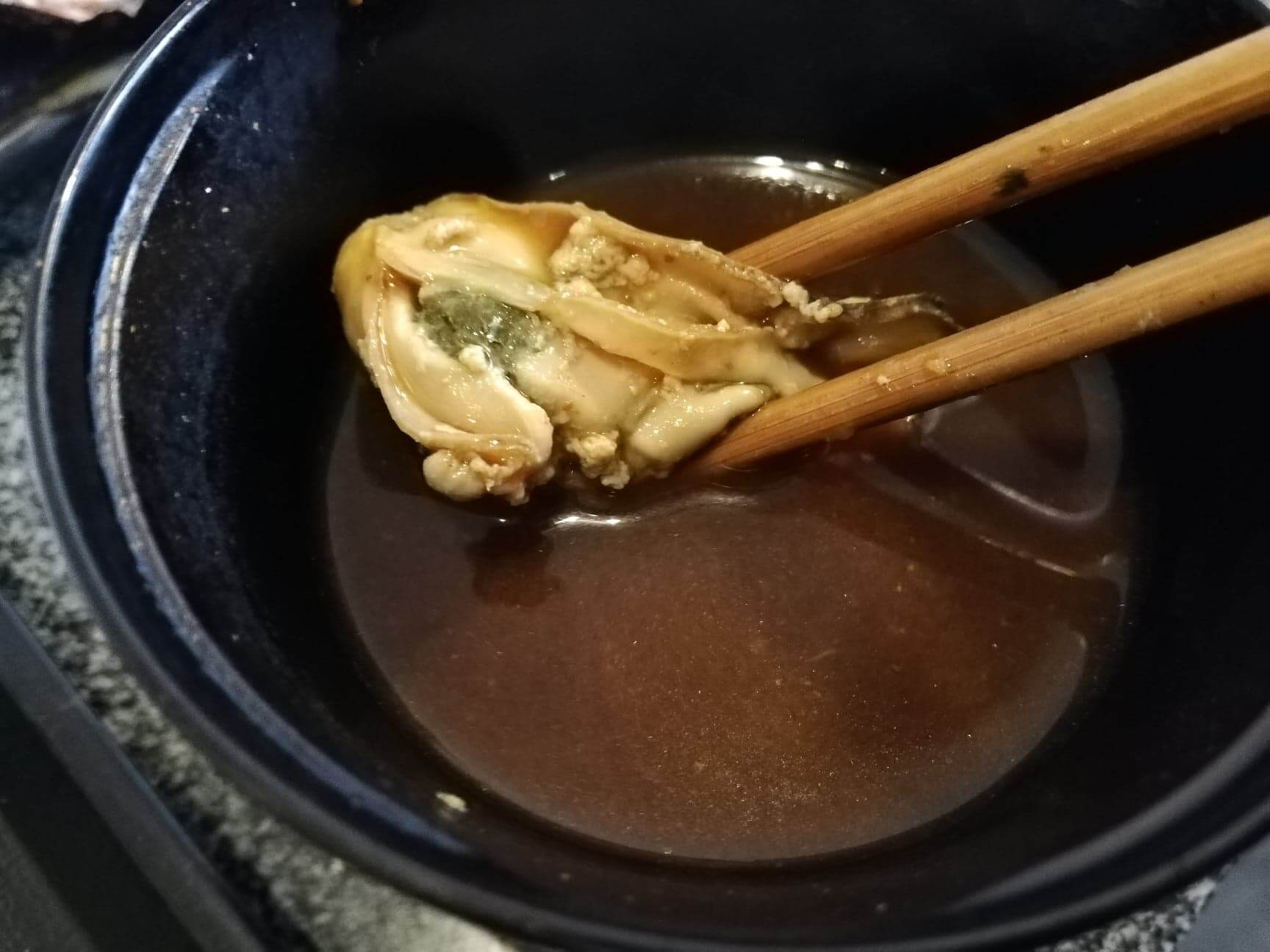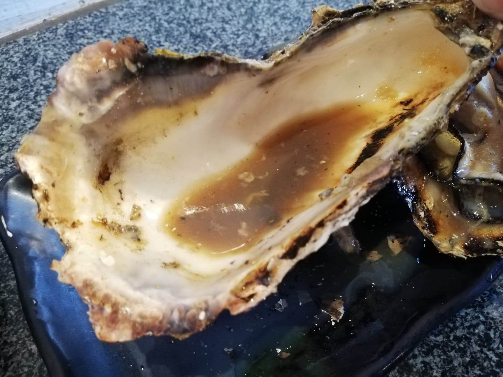 焼き牡蠣の殻に残るスープ、これがいい感じに苦味があるんですわ……。