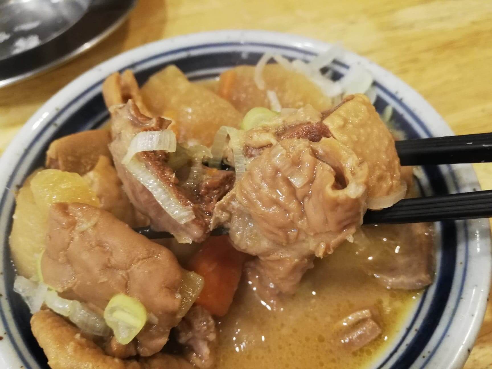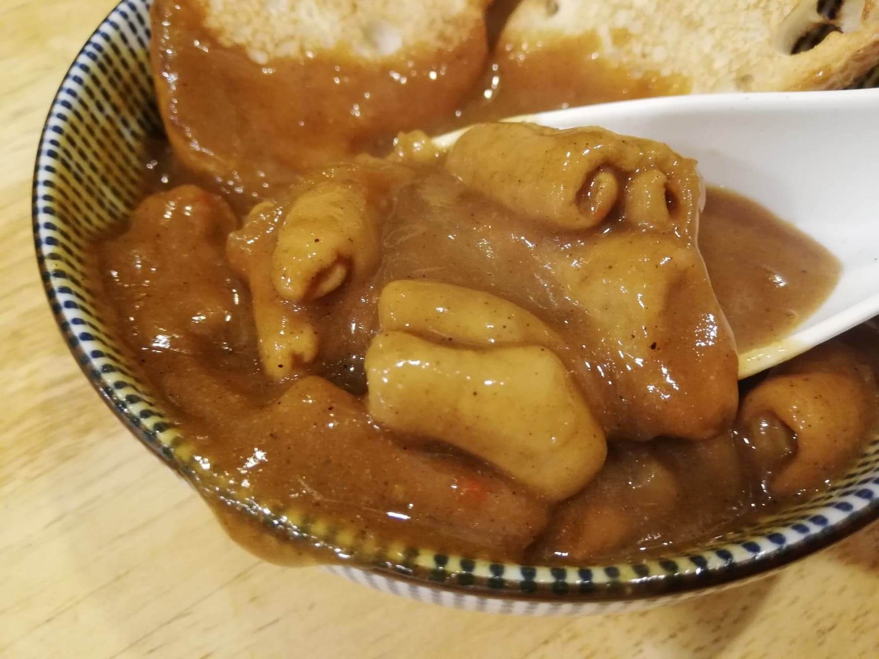デカ目のモツがゴロゴロ。こいつにコクのあるカレーがまっとりまとわりついて、口に放り込む。
