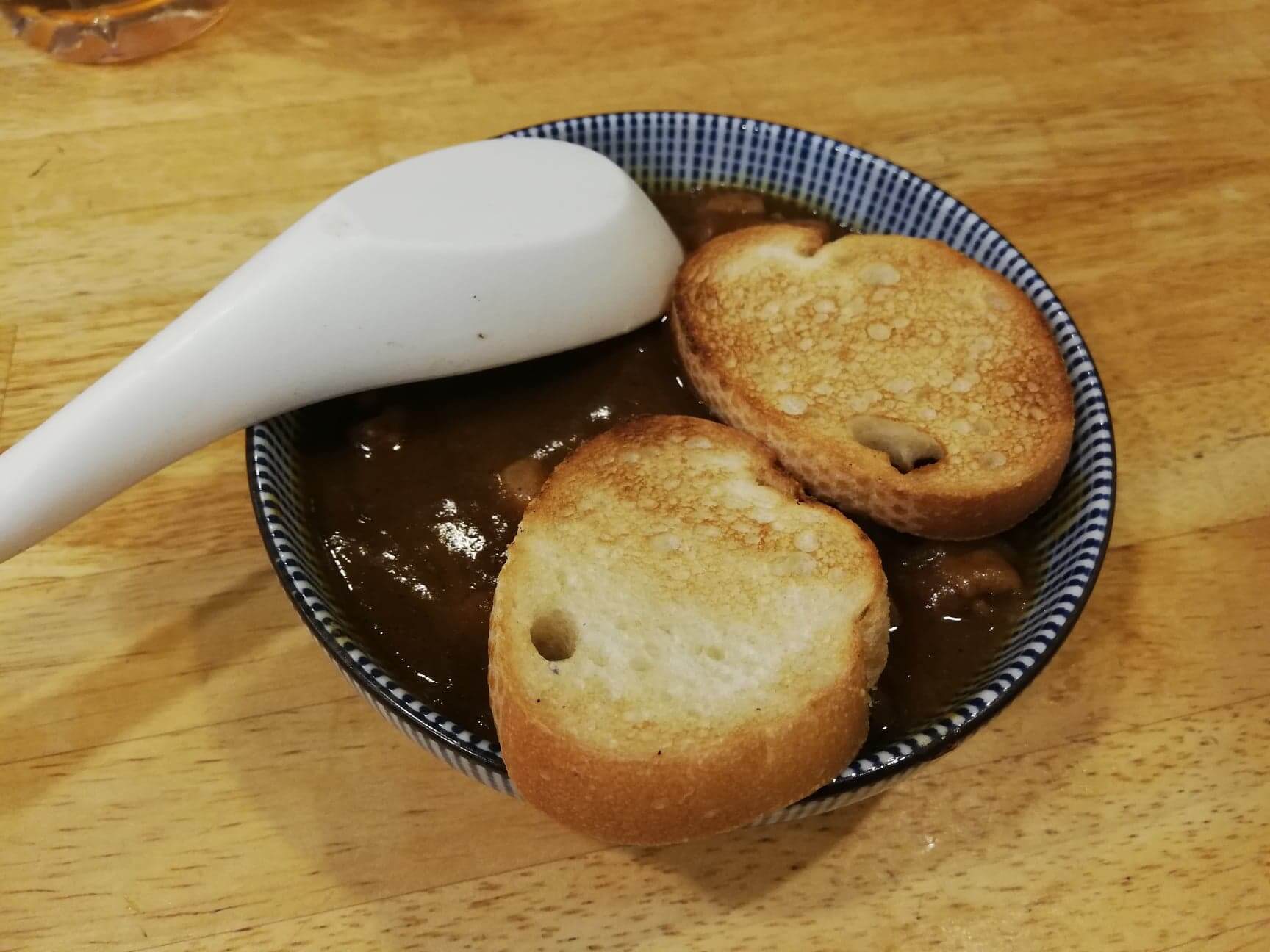モツとカレーという神がかりな組み合わせに加えて、バケットまで付いてくるという神。