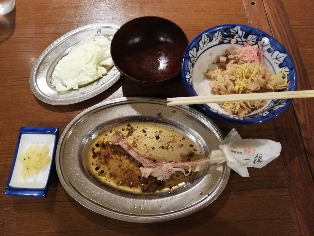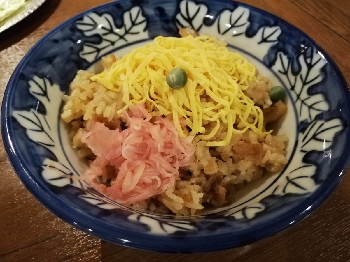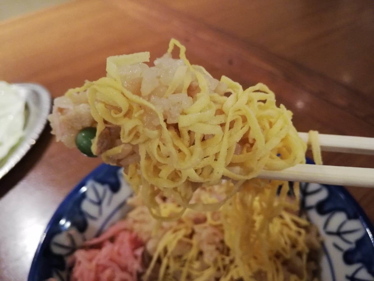 錦糸卵がめっちゃふわふわなんだよなあ……。ご飯にも骨付鳥の濃い味がよく合う!