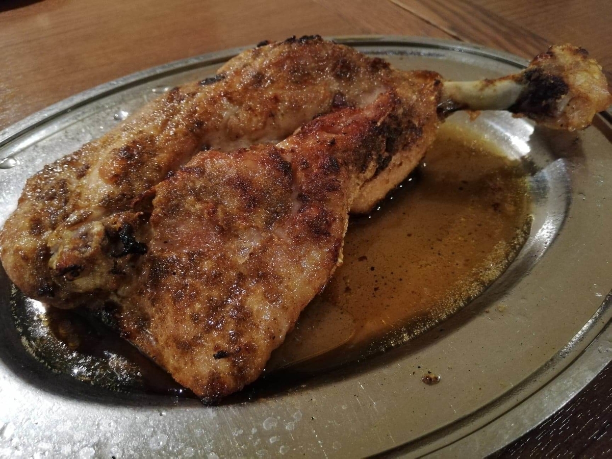 その名の通り、鳥のもも肉を骨ごと丸々一本焼いたものが『骨付き肉』!『特製のスパイスで焼き上げたお肉!』ということで、もうこの説明の響きだけでワクワクしますよね……!