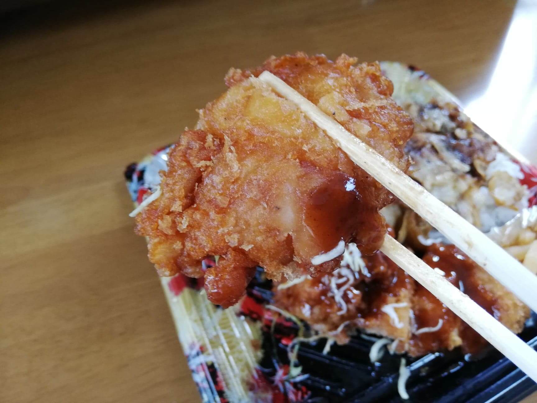 唐揚げの衣は油染み込み多め。ちょいとカリカリな部分もあり、そこと油の絡みがかなり好きです。