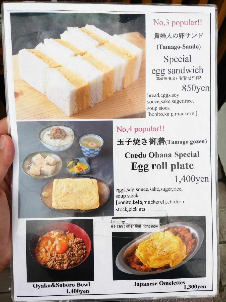 『小江戸オハナ』は、親子丼や卵サンドなどを中心に、人気の卵料理を食べれる専門店です。