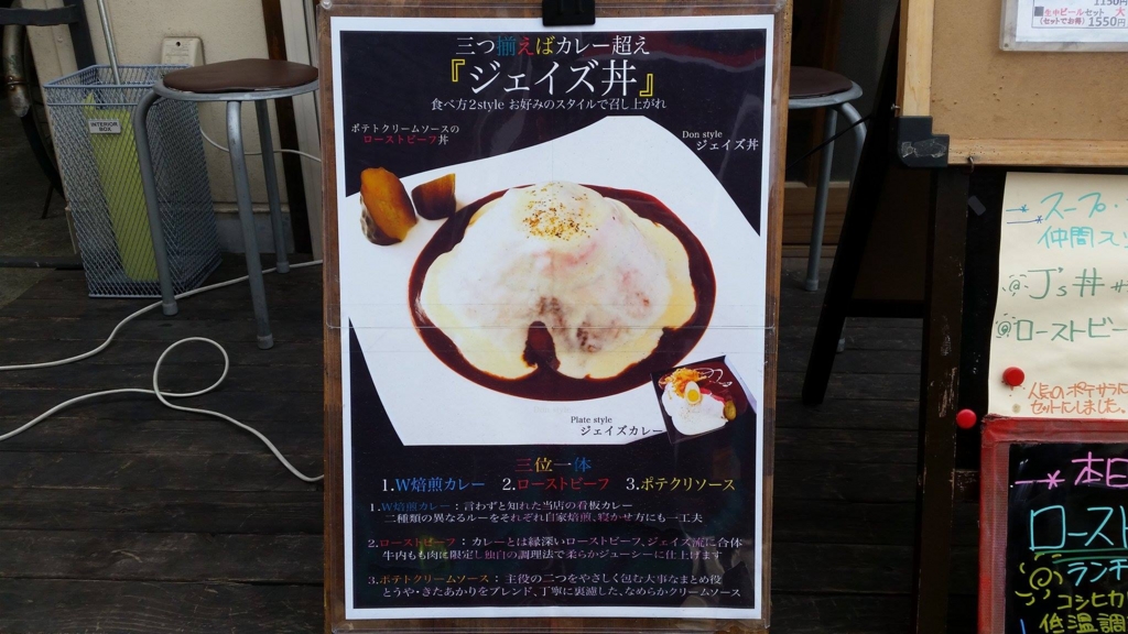 看板によると、「焙煎カレー」「ローストビーフ」「ポテクリソース」なるトリオが我々を楽しませてくれるとのこと。
