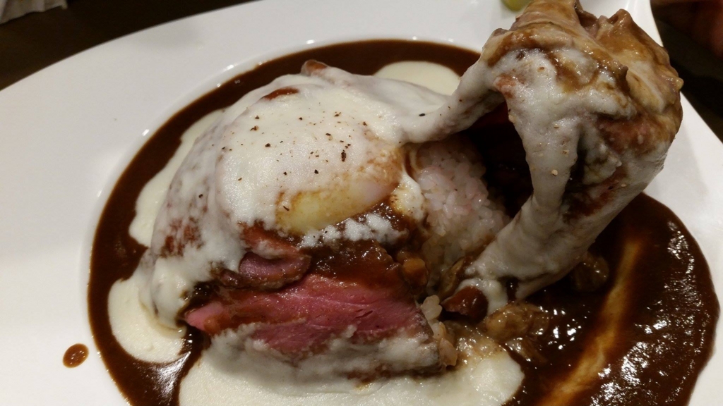 こういう濃厚同士の豪華な共演が大好きな僕。今回もまさにそれ。濃厚そうなソースとカレーが一気にぐああああっと混ざり合います。すでに美味しそう。