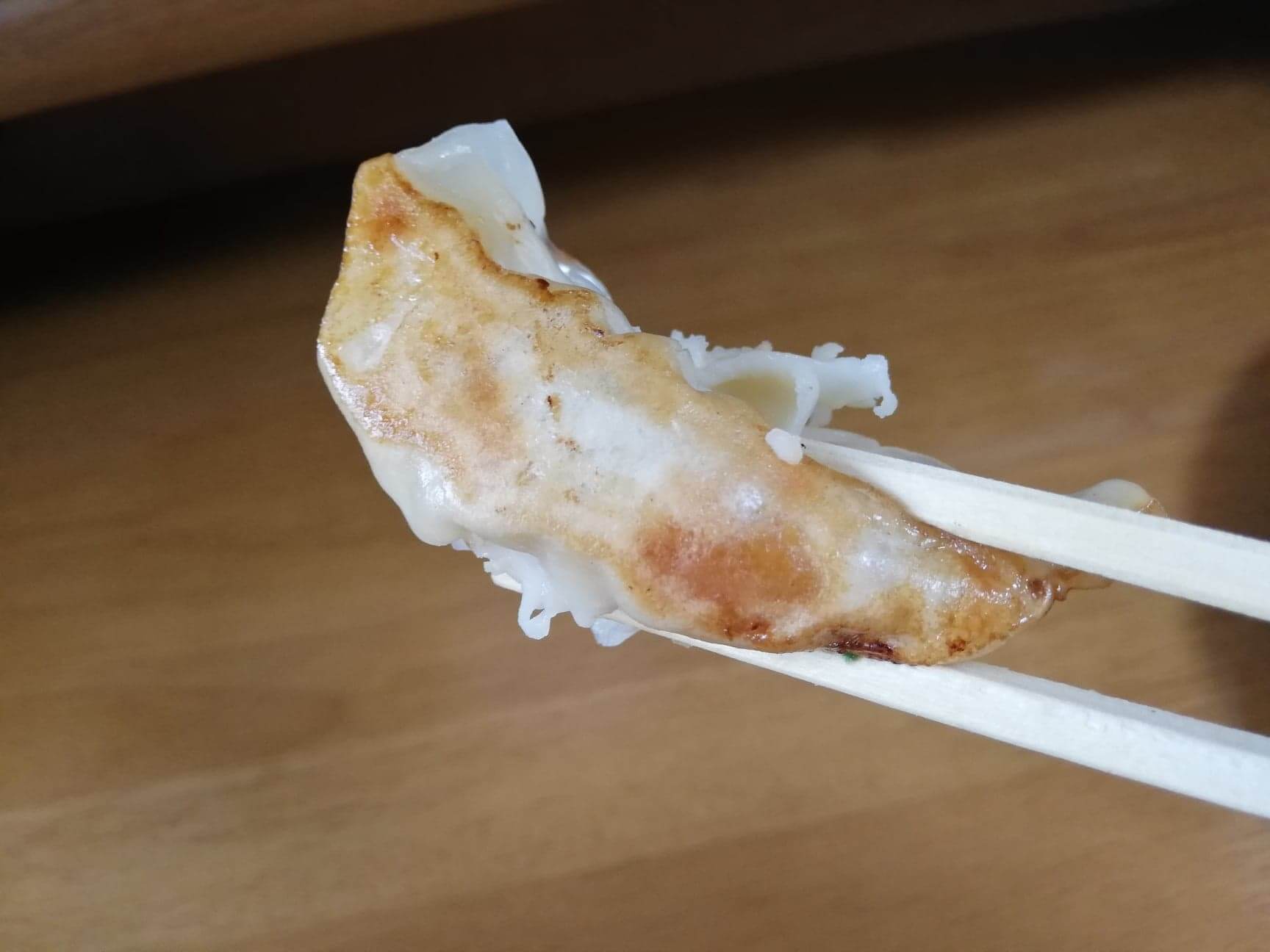 餃子は全体的にモッチリした食感!特に裏側の皮が良いですね。ニンニクの風味が結構強めで、お酒とかにも合いそうなお味です。