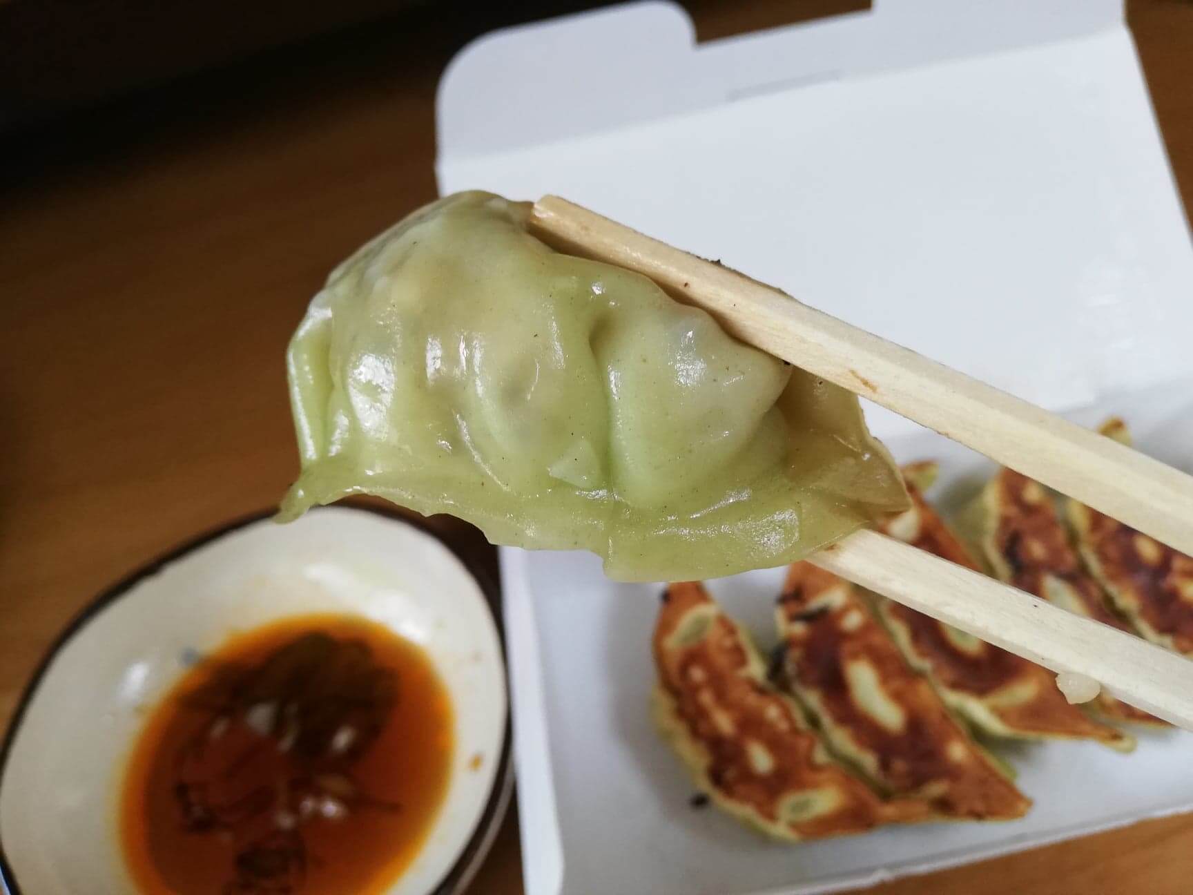 お次はベジタブル餃子!このように裏側が緑色が結構強め。
