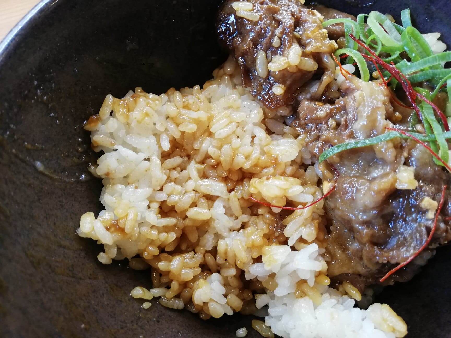 くら寿司の平日限定ランチ『牛カルビ丼ガーリック』のご飯のアップ写真どうです?ご飯にもしっかり染み込んだタレ達。ほどよくベチャついているので、結構ジャンキーな雰囲気で食べられます!