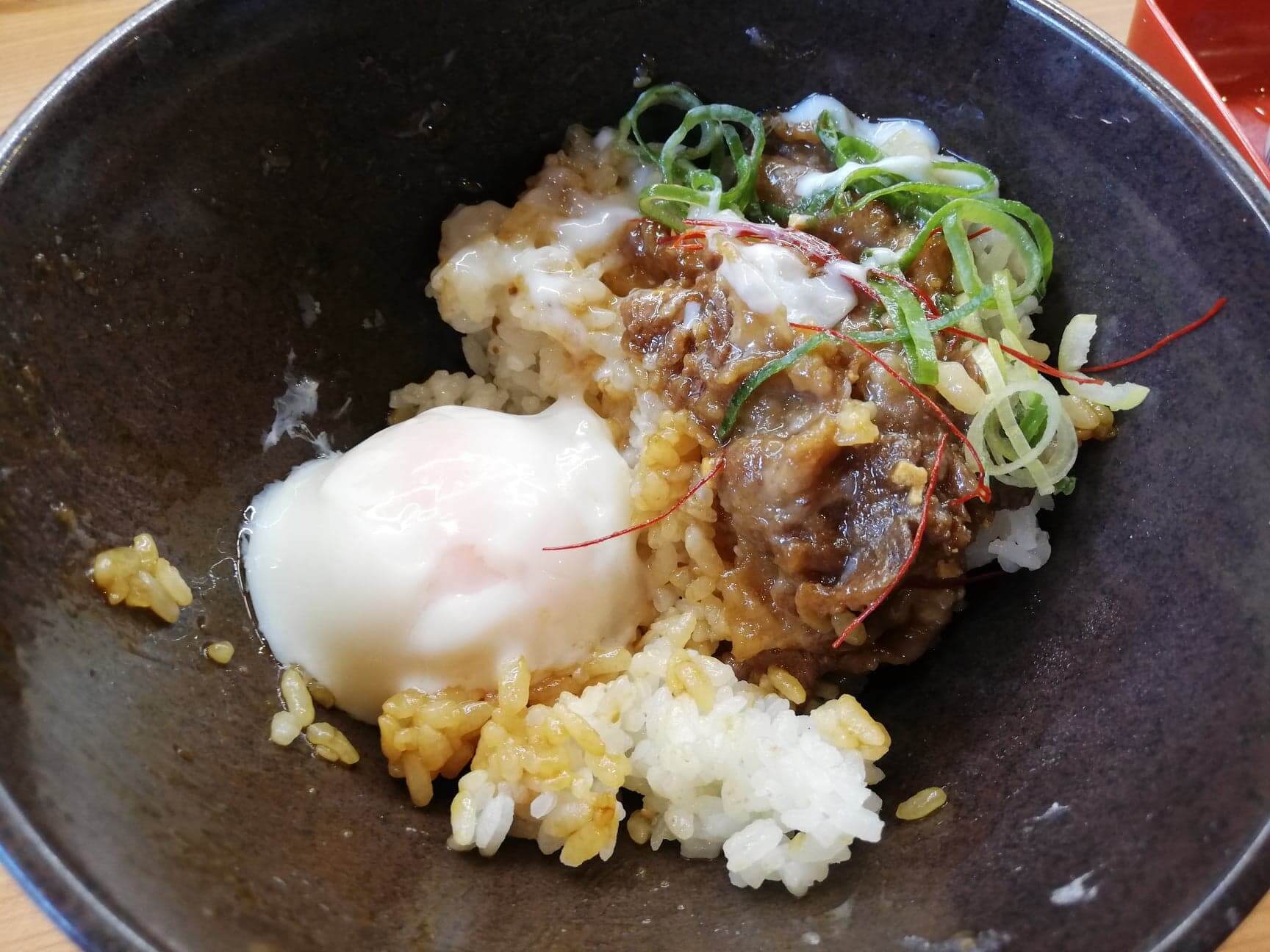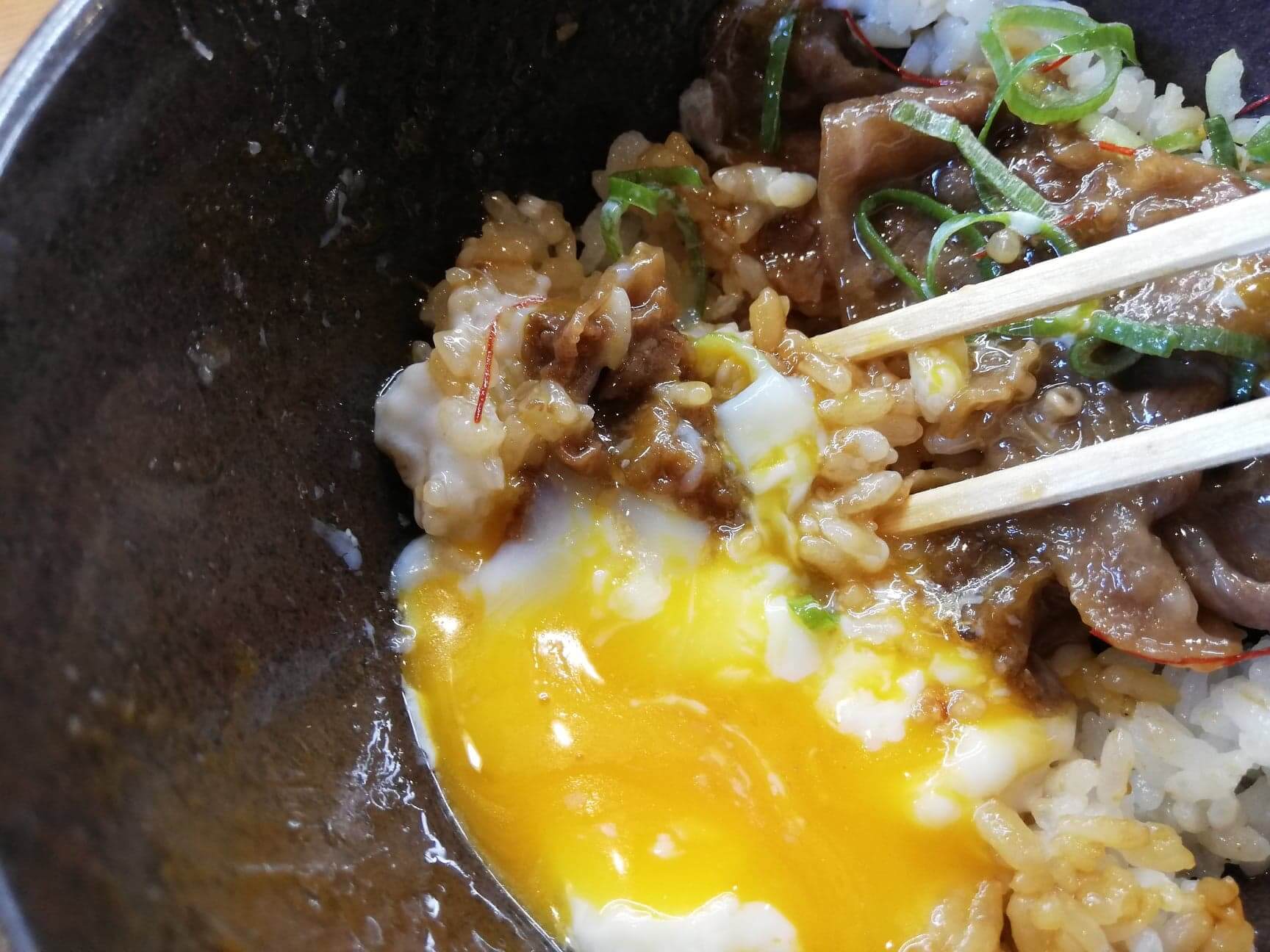 くら寿司の平日限定ランチ『牛カルビ丼ガーリック』に温泉卵を入れた写真 くら寿司の平日限定ランチ『牛カルビ丼ガーリック』に温泉卵を入れて割った写真仕上げの温泉卵!こいつも入れてグッチョグチョにして食べ尽くしてやりましょう。