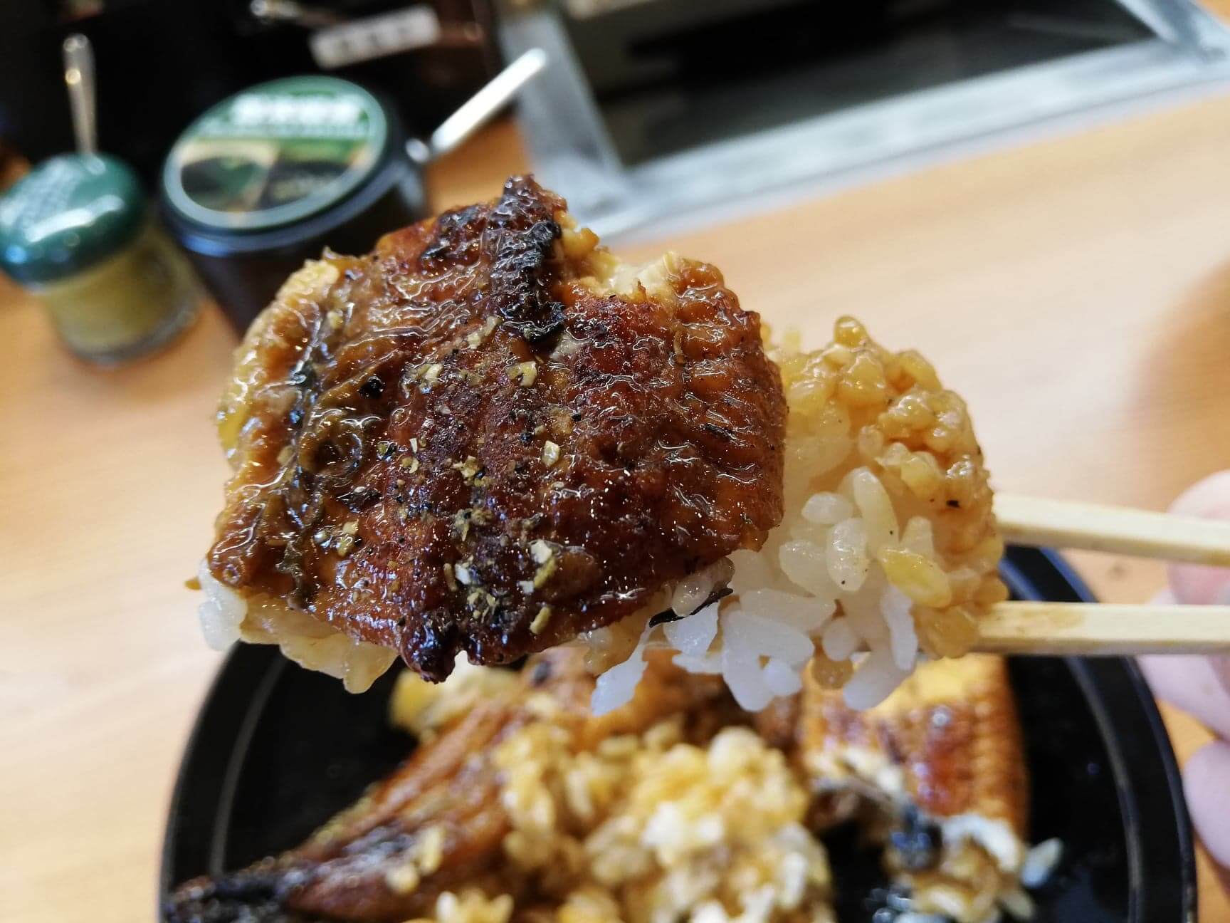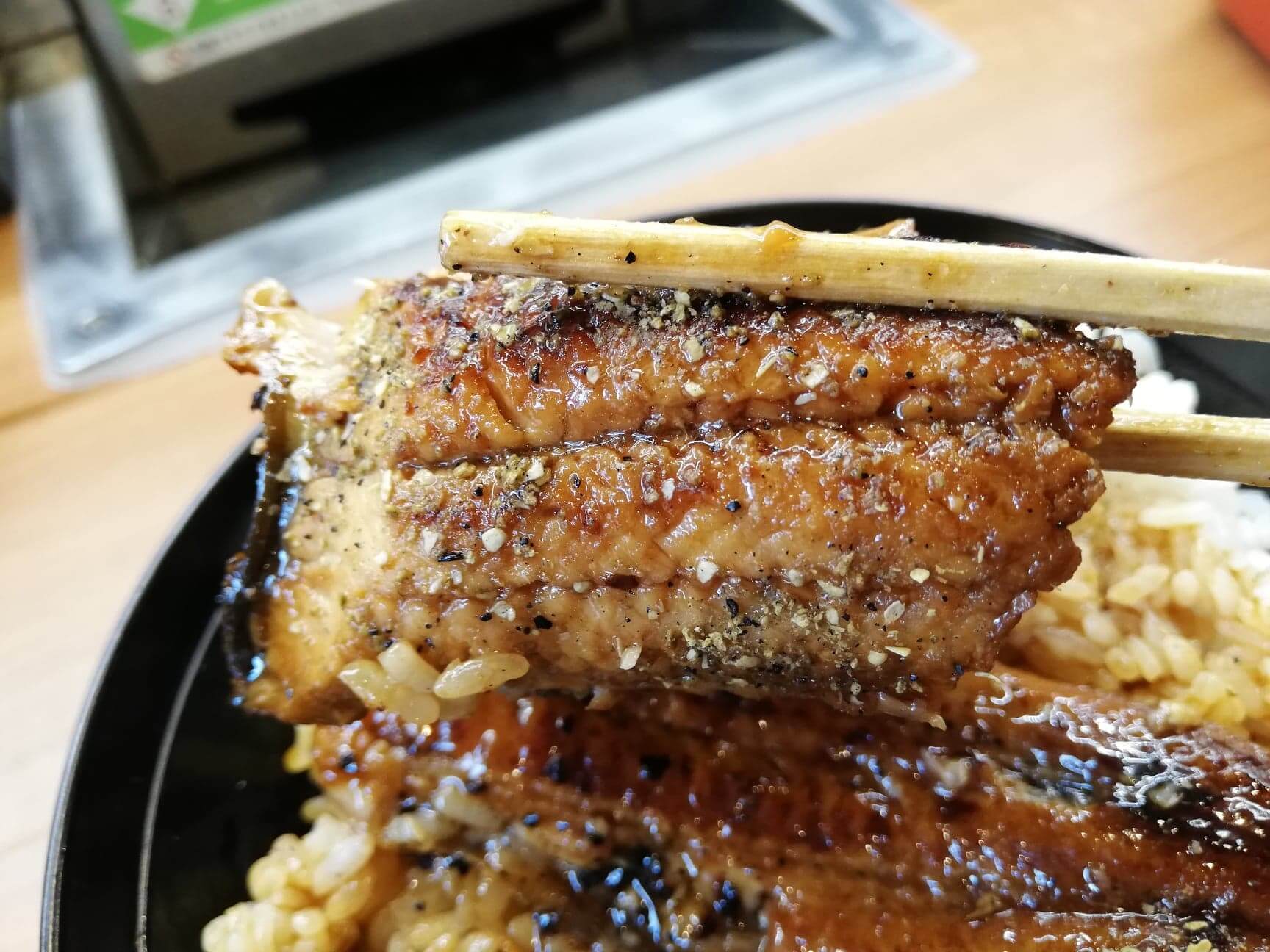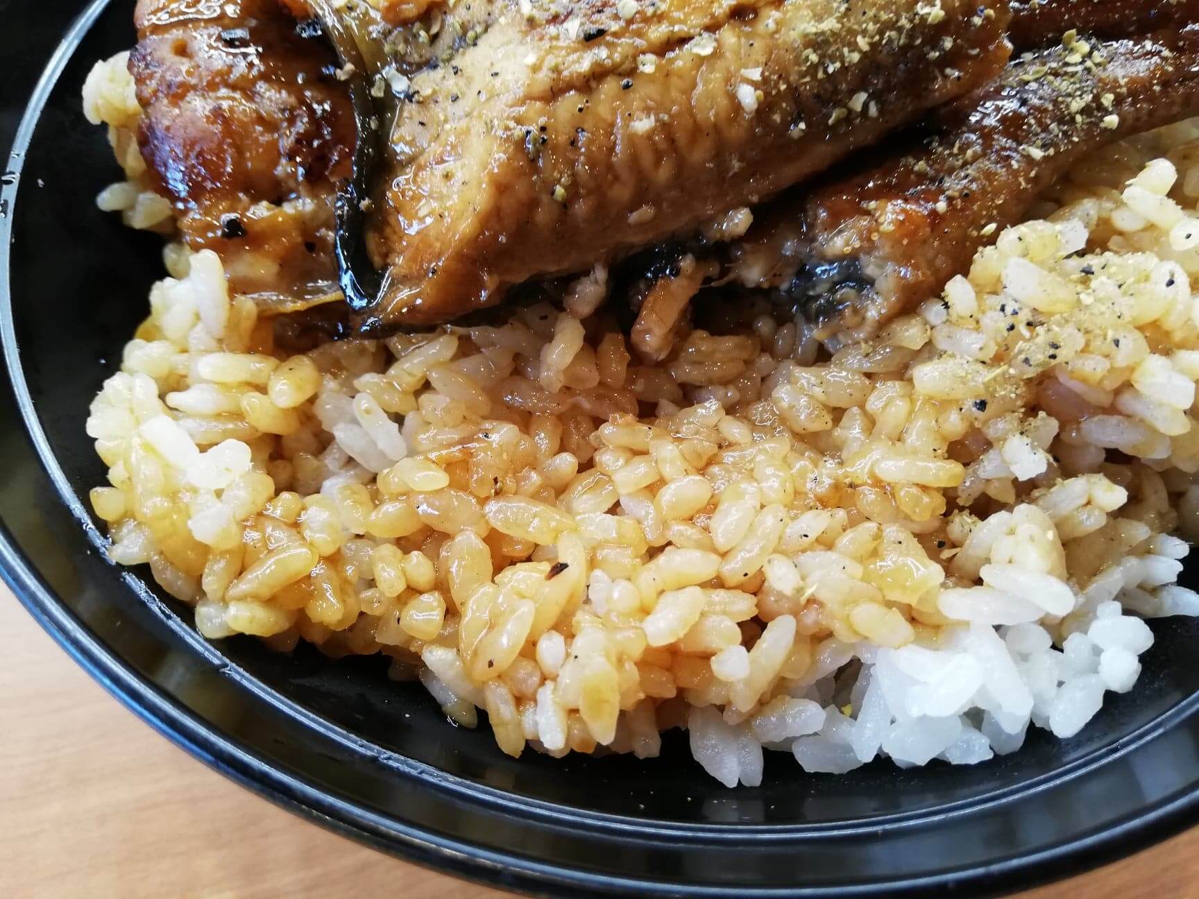 くら寿司の平日限定ランチ『特上うな丼ランチ』のうなぎの写真脂も乗っていてプリプリ!付属の胡椒を全部入れると舌が微妙にヒリヒリするので量は注意しましょう。