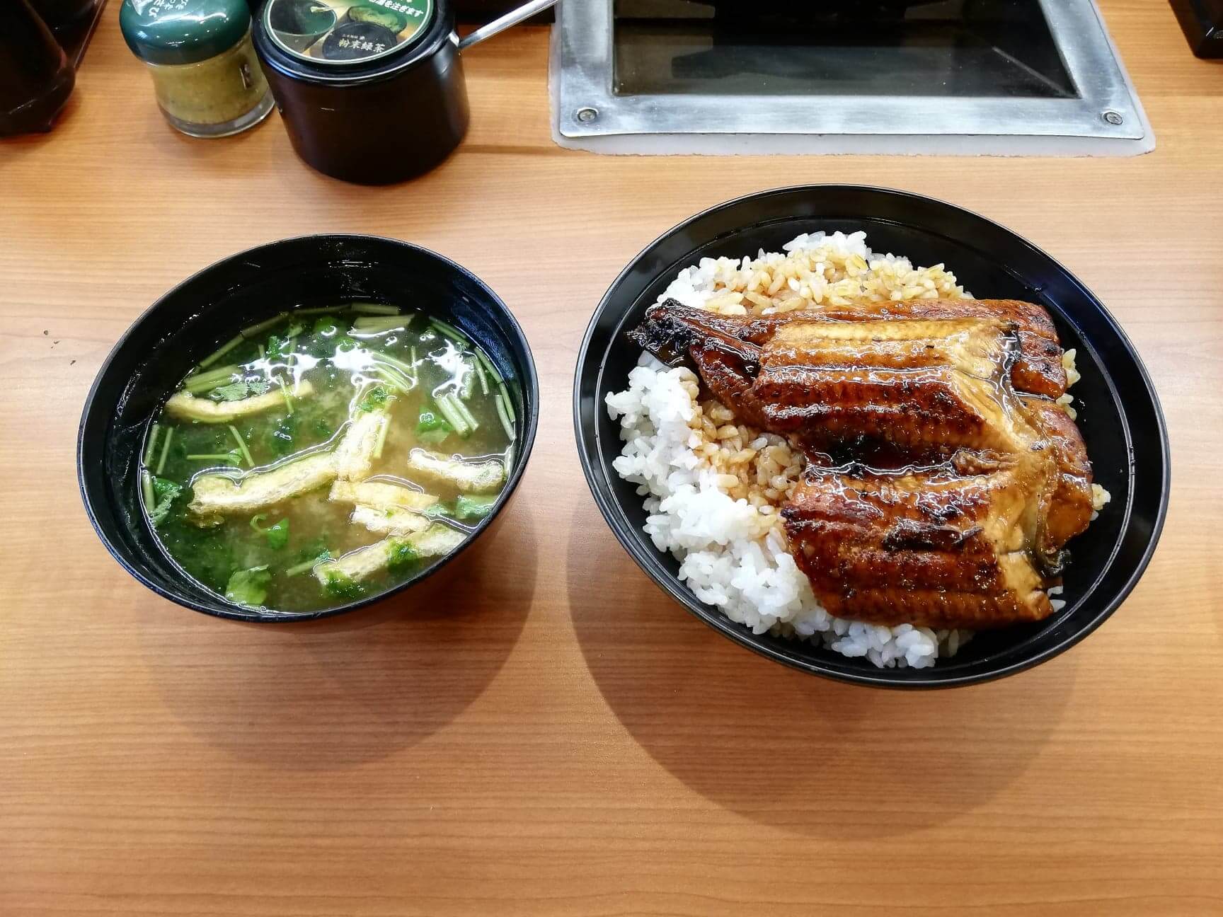 くら寿司の平日限定ランチ『特上うな丼ランチ』のセット写真 くら寿司の平日限定ランチ『特上うな丼ランチ』の写真という感じで、『特上うな丼ランチ+あおさ入り味噌汁1,000円』を追加!