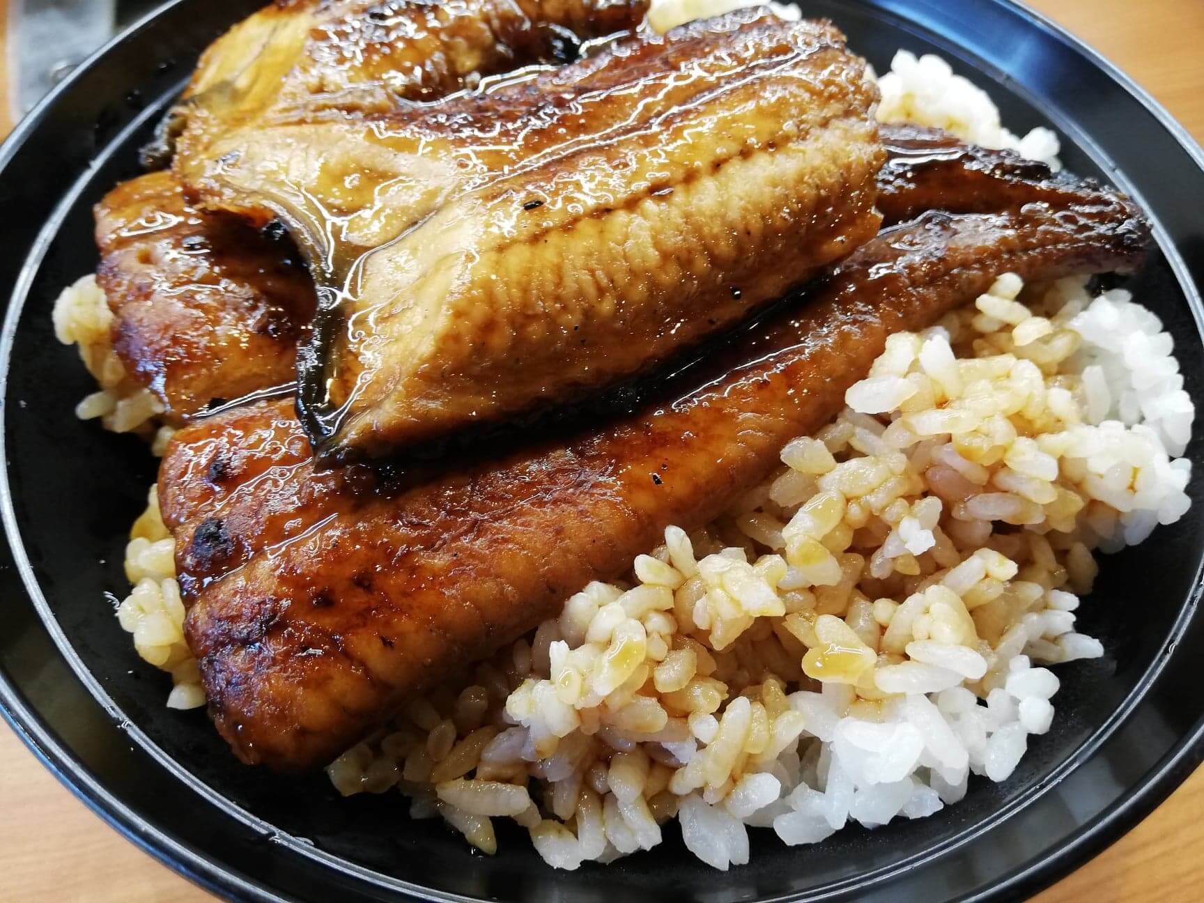 くら寿司の平日限定ランチ『特上うな丼ランチ』のご飯のアップ写真きちんとご飯にもタレがぶちまけてあるのは、良い丼の証拠。