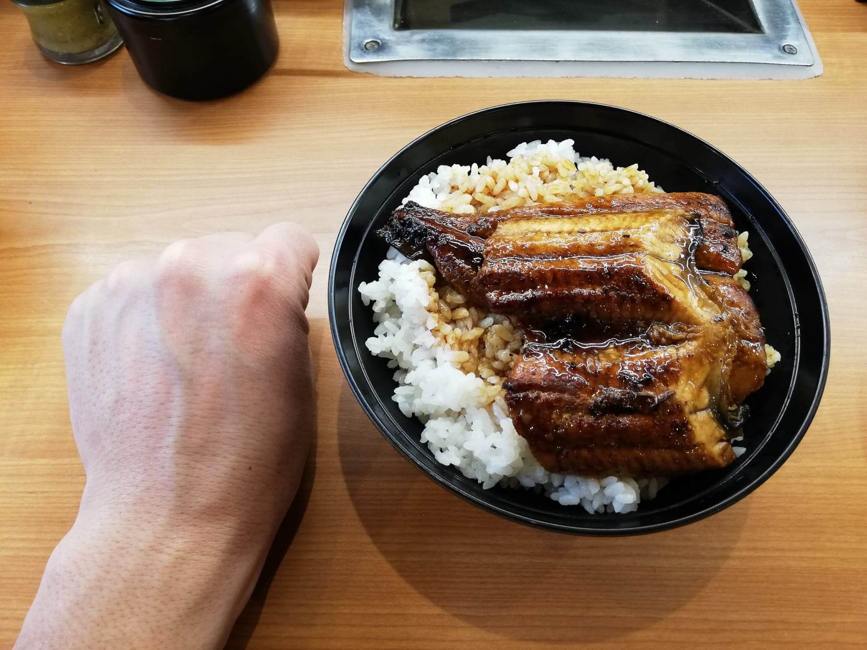 くら寿司の平日限定ランチ『特上うな丼ランチ』と拳のサイズ比較写真サイズは牛丼と同じくらい!うなぎのタレもたっぷりかかっています。