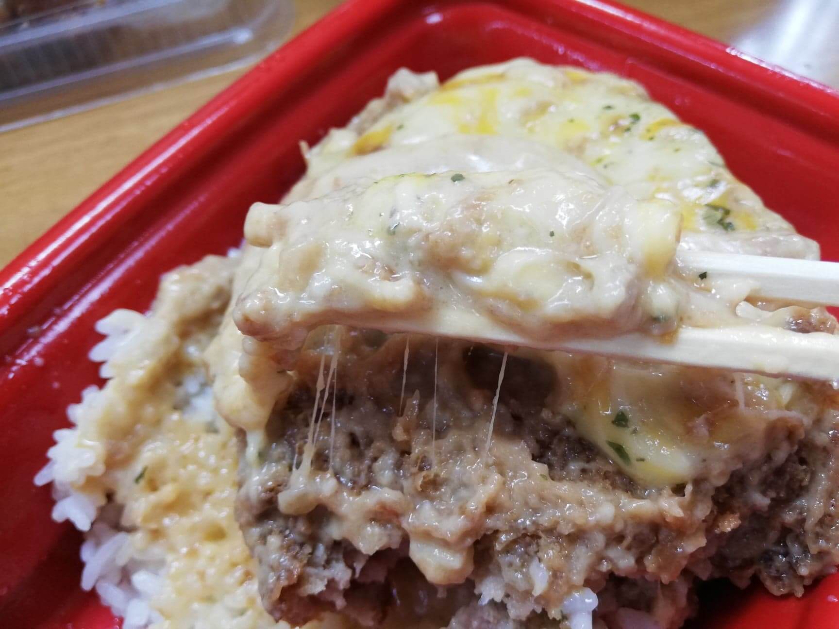 まずは、ごちそうハンバーグファミリーセットの一つ『ホワイトガーリックチーズソース定食』から食べようと思い蓋をパカッ。