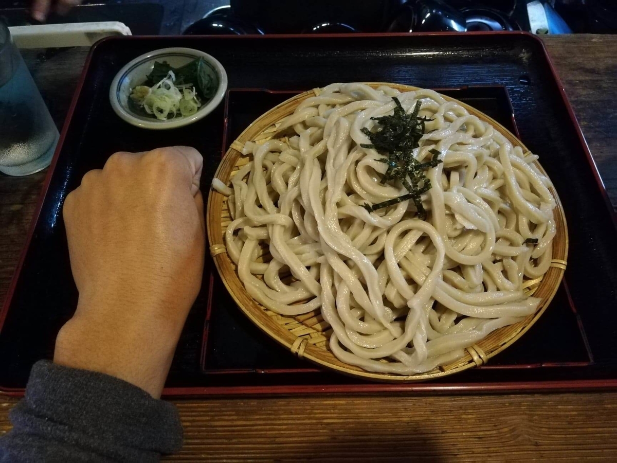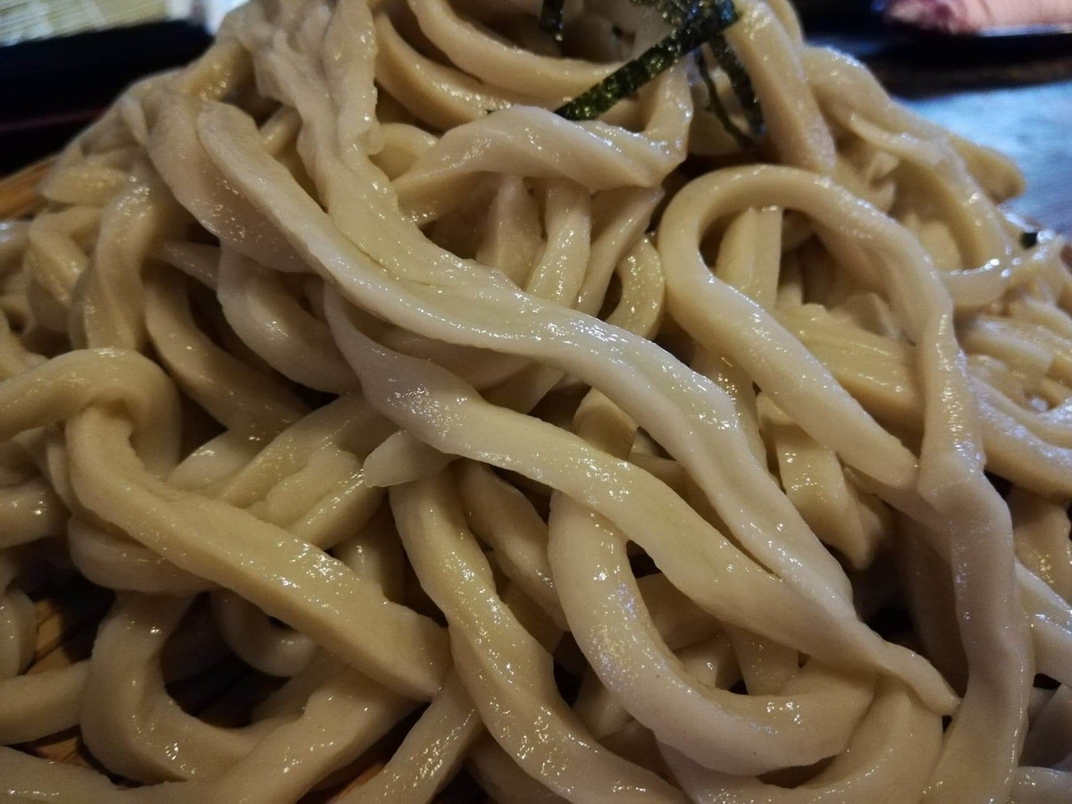 荒く切られた太麺が荒くザルにドカンと盛られているなあ。これは素敵なボリュームだ。