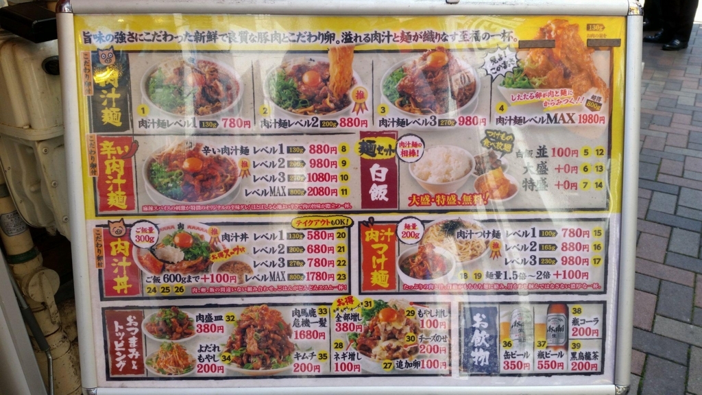 丼ものもありますが、今回は店名通り『肉汁麺レベル3』980円を選択。肉の量は270g!仕事中のランチですし、さすがに800gに手を出すのはためらいました……。