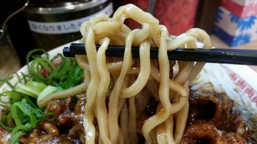 麺は太麺で、これまたモッチモチ!かみごたえは結構硬めですね。少し生っぽさに近い感じです。