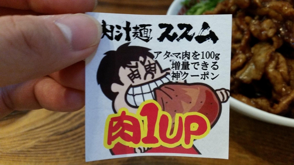さて、肉汁麺を堪能したわけですが、こちらのお店では行くと必ず肉100g増量クーポンがもらえます!