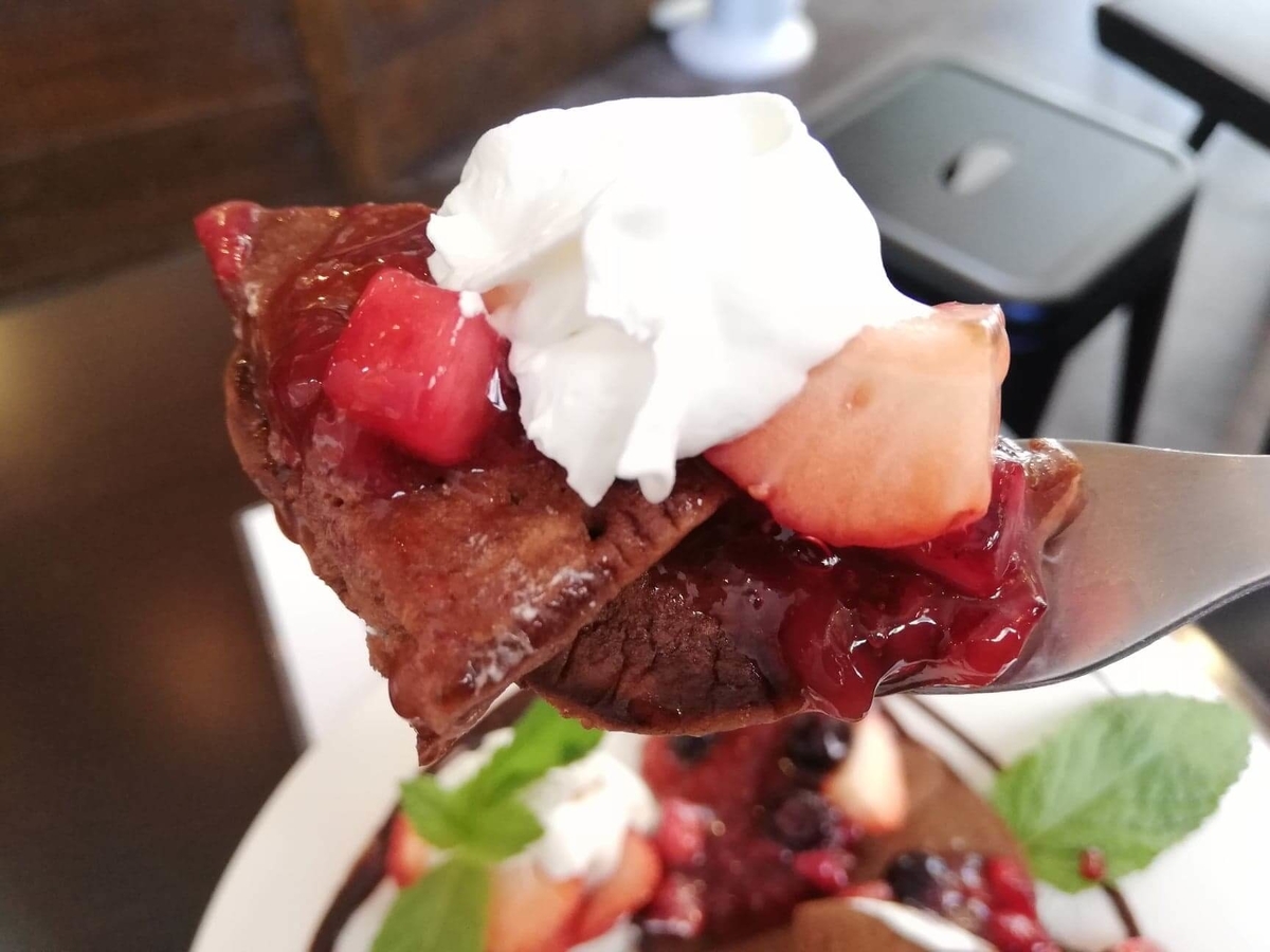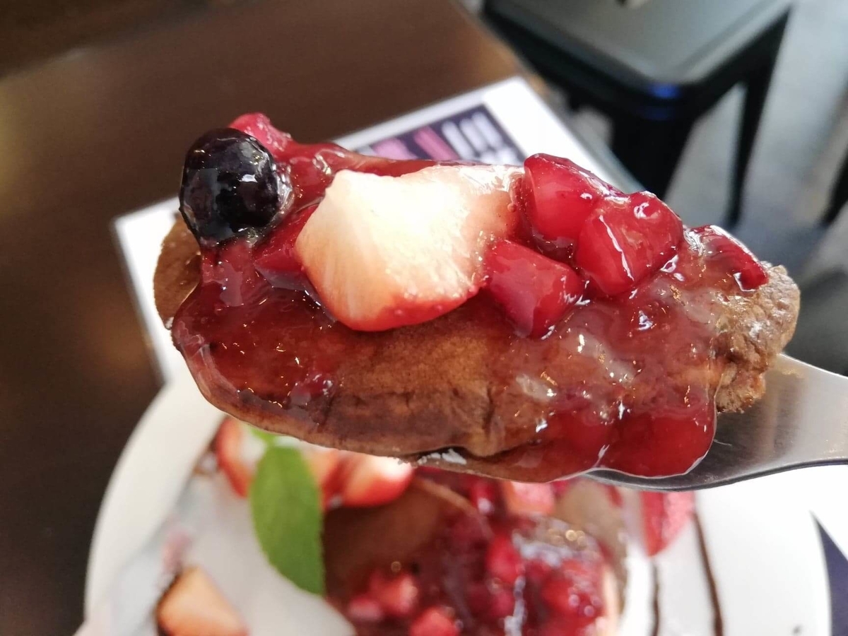 三軒茶屋『CAFE HOME MADE(カフェホームメイド)』のゴリラパンケーキのミックスベリーを持ち上げている写真ストロベリーやブルーベリーなど、複数ベリーの酸味!シャキシャキしたブルーベリーの食感も良いですねえ。