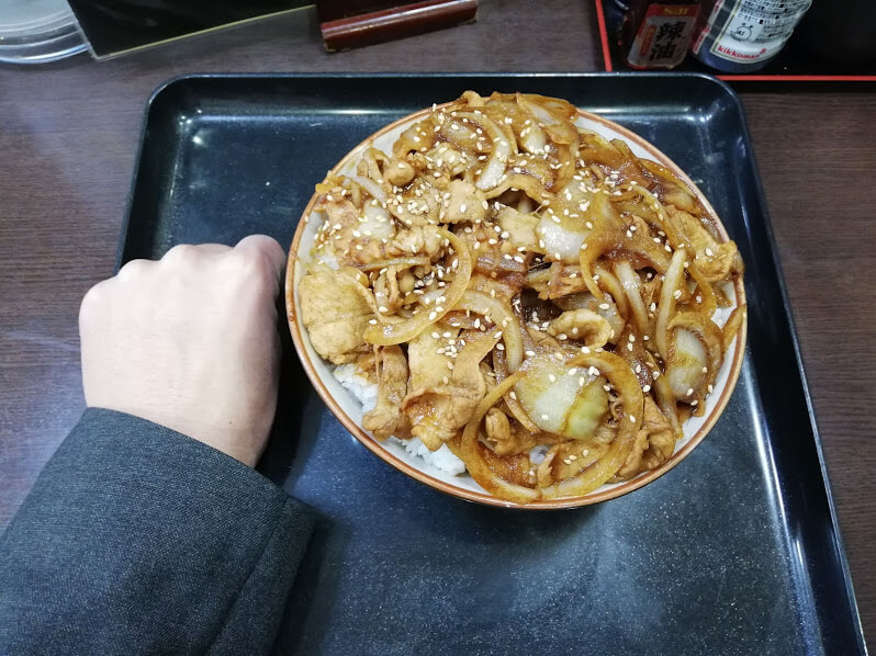 仙台『久美食堂』の焼肉丼と拳のサイズ比較写真 仙台『久美食堂』の焼肉丼と拳のサイズ比較写真横も縦もデカい、素晴らしいデカ盛りが出てきました!