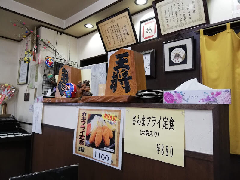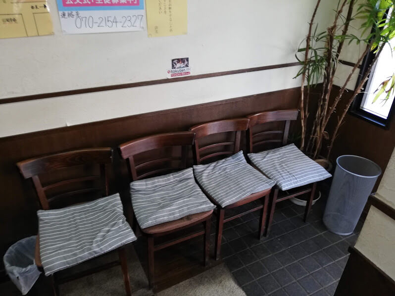仙台『久美食堂』の店内写真 仙台『久美食堂』の店内の椅子の写真でけえ将棋の駒がある。入り口には待機用のイスもありますね。平日でもランチはかなり混んでたので、休日は開店と一緒に入るのがいいかも。