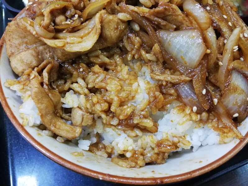 仙台『久美食堂』の焼肉丼の白米の断面写真半分食べるとキレイな白米の断面!器にびっちり入っていて重量感のあるビジュアルです。