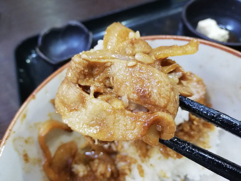 仙台『久美食堂』の焼肉丼のアップ写真タレがべちゃべちゃめ!め!め!器の上部に肉とタレが結構溜まっていますね。